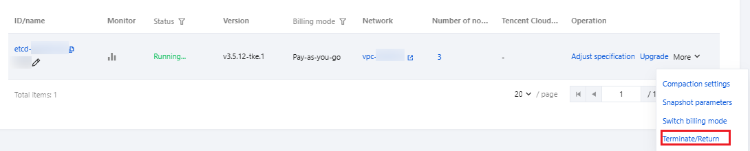 2. Choose More > Terminate/Return on the right of the cluster on the Cloud native etcd page, as shown in the figure below: