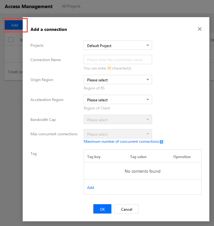 1. Login ke konsol GAAP, masuk ke halaman Access Management (Manajemen Akses), dan klik Create (Buat). 2. Di jendela pop-up, masukkan informasi koneksi.
