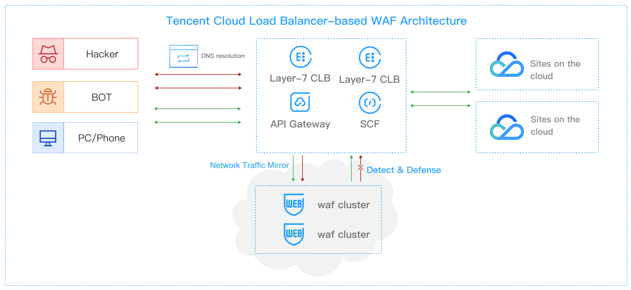 How to choose | If users have websites both on Tencent Cloud and on-premises that require protection, or if Layer-7 load balancing is not used on Tencent Cloud, SaaS WAF is recommended. If webpage tampering prevention and data leakage prevention are needed, only SaaS-based WAF can be used. | Tencent Cloud users who are already using or planning to use Layer-7 load balancing (CLB), Cloud Native Gateway, or SCF, and require Web security protection, BOT traffic management, Cybersecurity Classified Protection Compliance Service, or website security operations, are recommended to adopt Cloud Native WAF. |