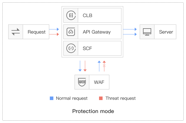 Cloud Native Gateway and SCF domain configuration | By enabling WAF protection through the API Gateway console (refer to the API Gateway product documentation) and SCF console, and configuring the domain name in the WAF console's domain access settings, bypass threat detection and cleansing are performed on HTTP/HTTPS traffic passing through the Cloud Native Gateway and SCF gateway, achieving separation of business forwarding and security protection. |