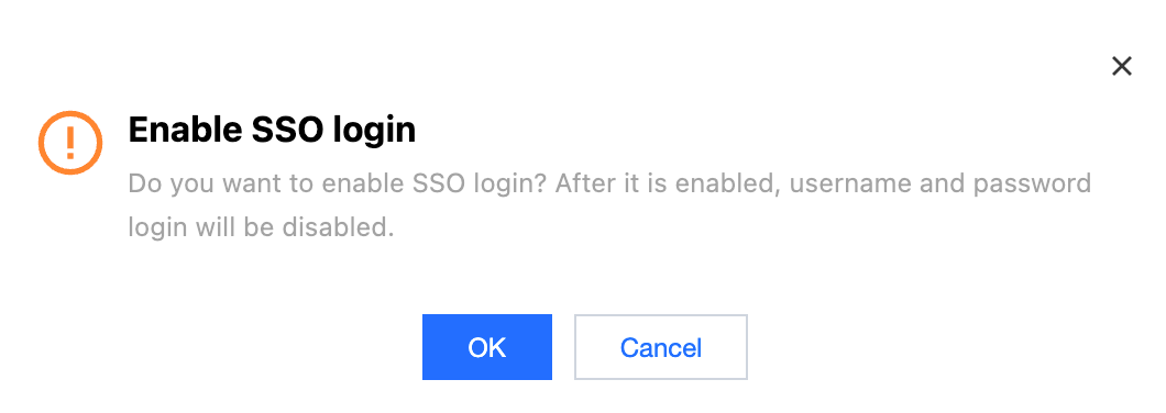 1. ログイン TCO > アイデンティティセンター管理 > 設定 ページで、SSO ログイン エリアで、SSO ログインのスイッチを有効にします。 2. SSOログインの有効化ダイアログで、確定をクリックします。