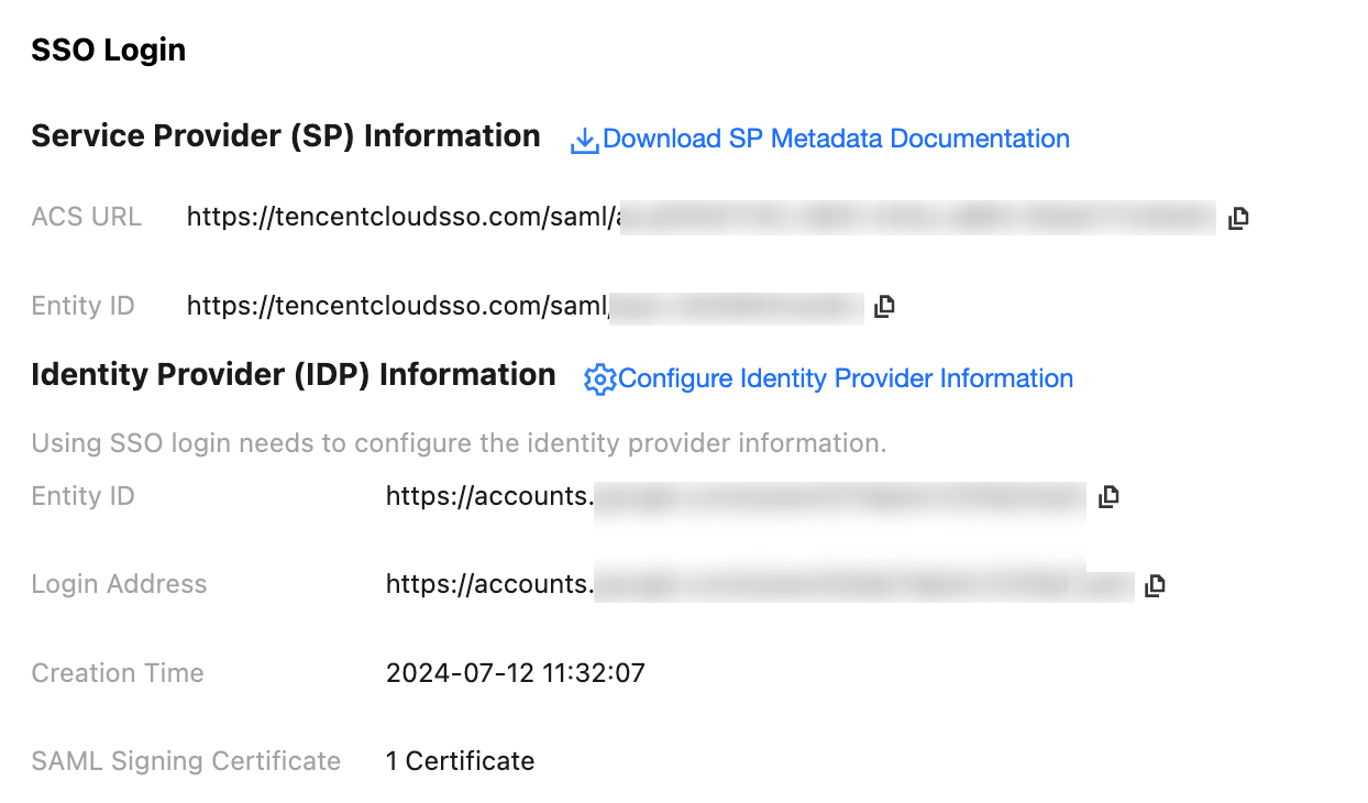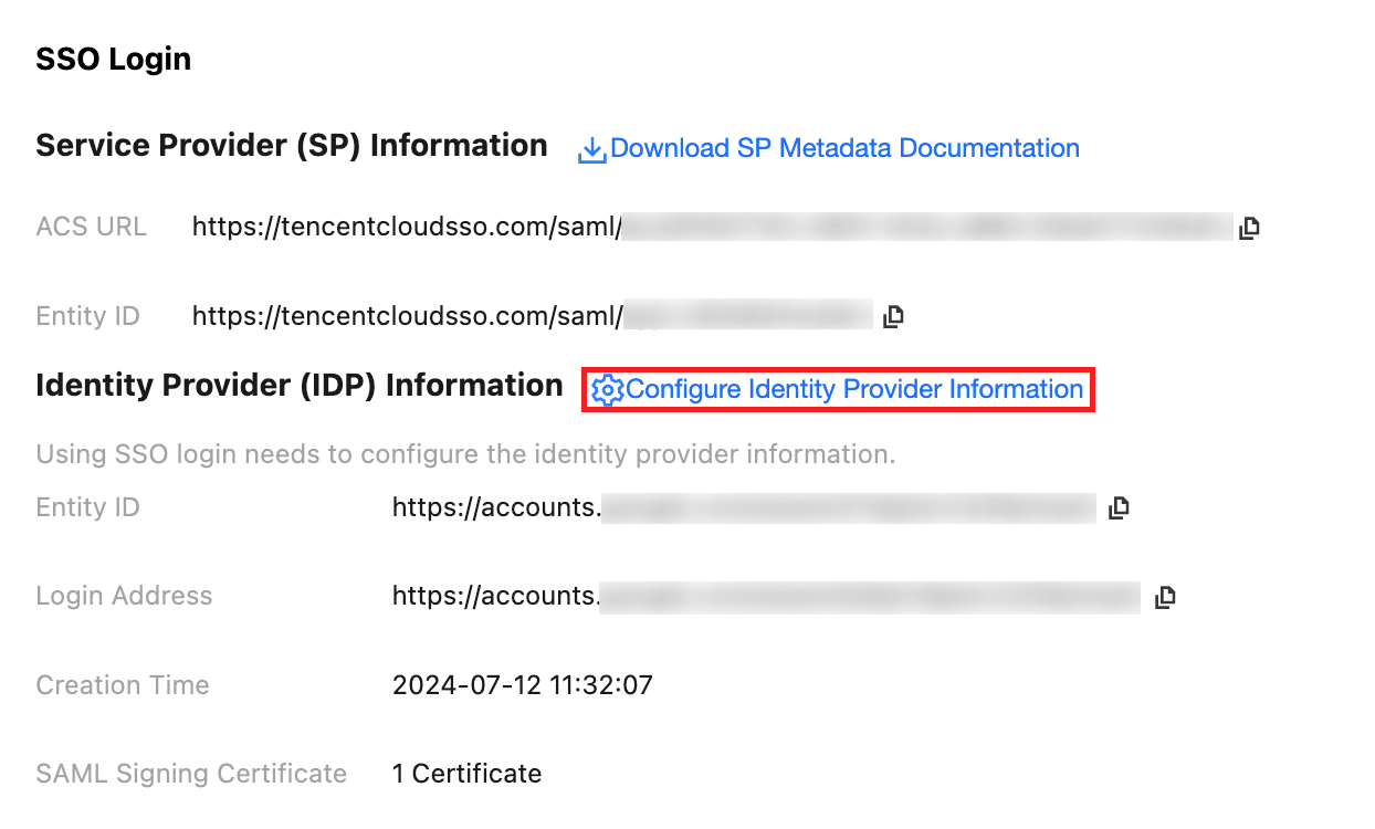SSOログインを有効にした後、アイデンティティプロバイダ情報の設定を行うことができます。