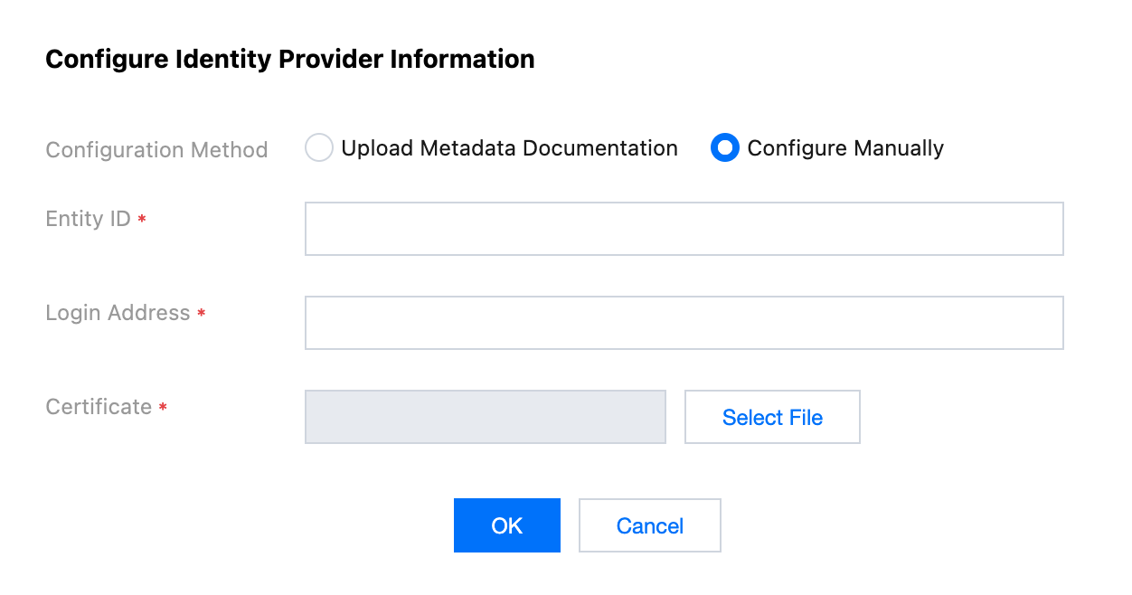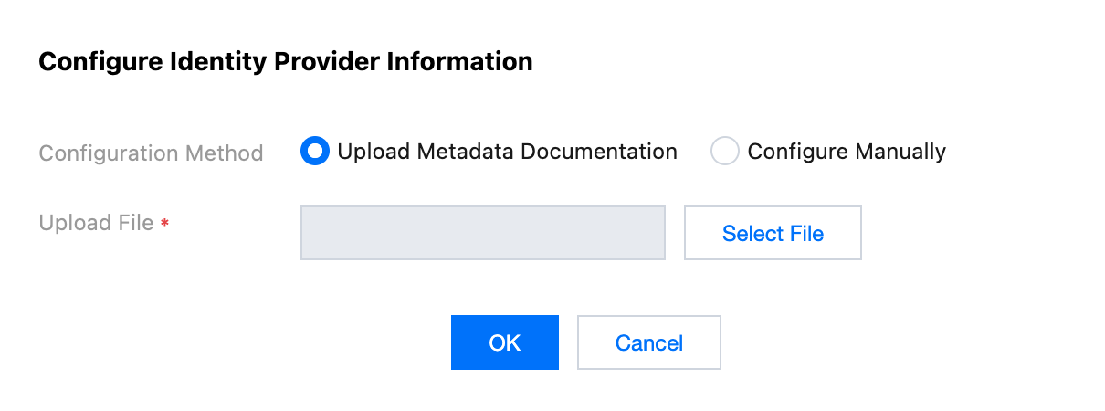 3. IdP情報の設定ダイアログで、メタデータドキュメントのアップロードまたは手動設定を選択し、IdP情報を設定します。