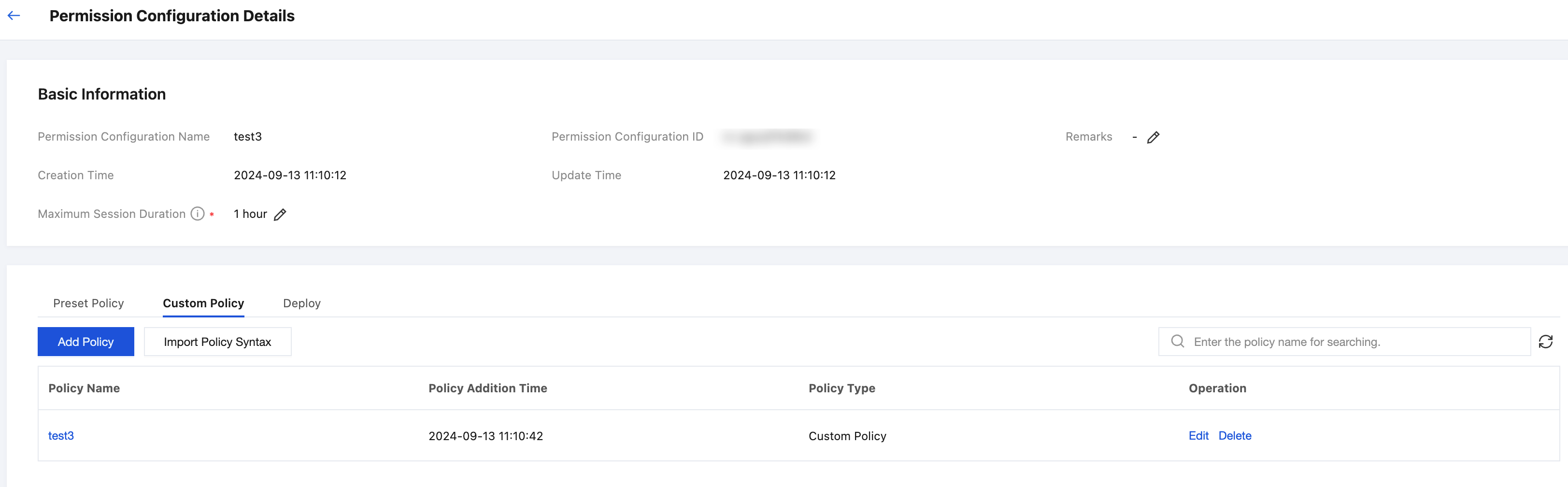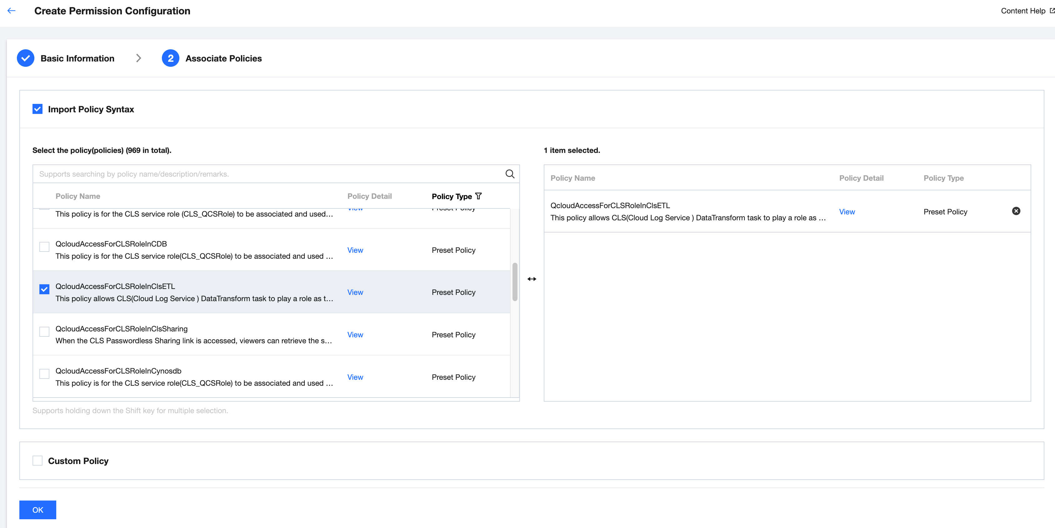 6. カスタムポリシータブをクリックし、権限設定のカスタムポリシーを参照します。