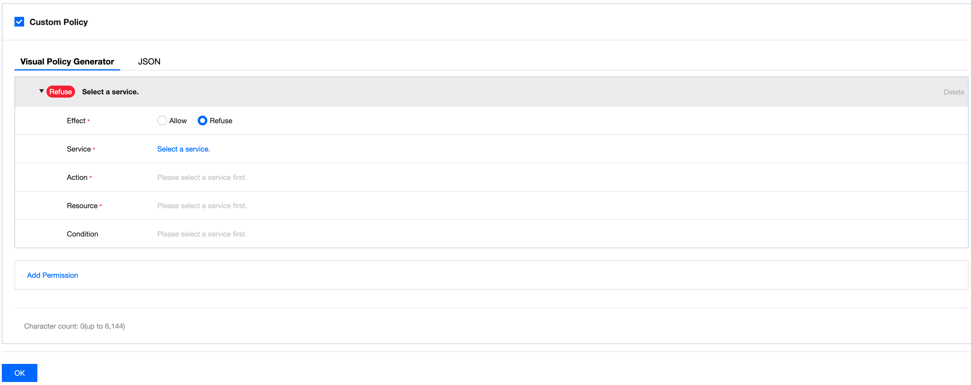 カスタムポリシーを追加します。カスタムポリシーはCAMのポリシー構文を再利用します。構文ロジックについては、構文構造を参照してください。 6. OKをクリックします。
