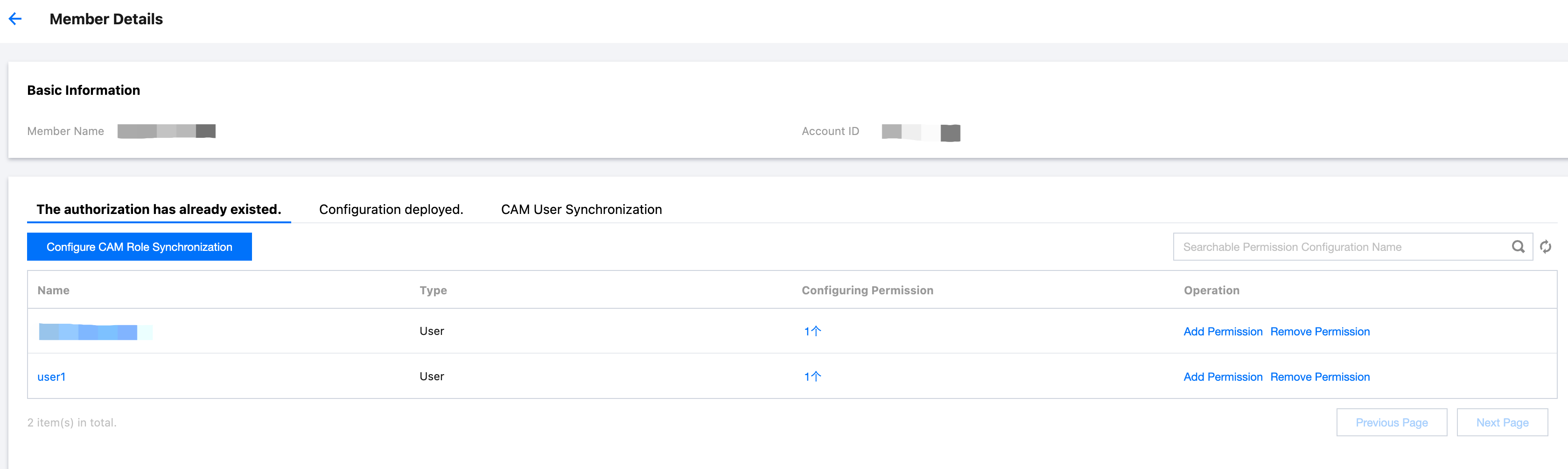 2. 左側のナビゲーションバーで、CAM 同期 > マルチアカウント権限管理をクリックします。