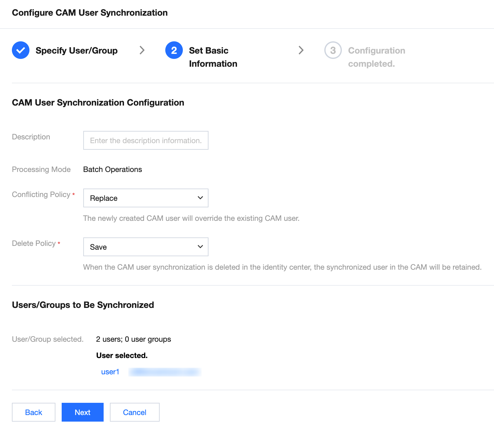 設定が成功すると、ターゲットアカウント内に同名のCAMユーザーを作成します。この例では、メンバーアカウント(Account1)内で、アイデンティティセンターのユーザー(user1)と同名のCAMユーザー(user1@tencent)を同期的に作成します。