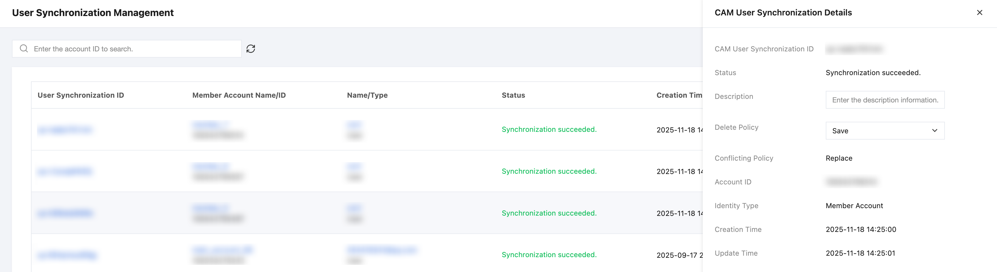 4. ユーザー同期詳細パネルで、ユーザー同期の詳細を参照します。これには、CAMユーザー同期ID、状態、削除ポリシー、コンフリクトポリシー、作成時間などが含まれます。