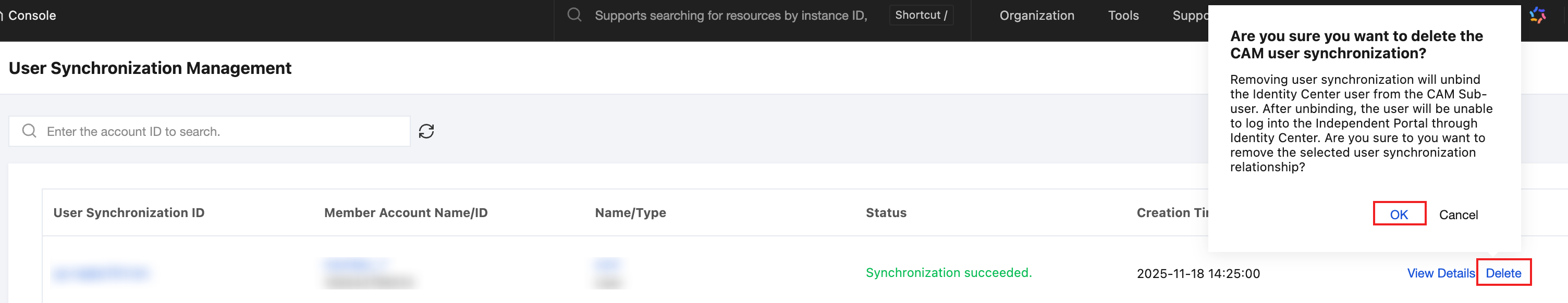 3. ユーザー同期管理ページで、対象ユーザー同期の操作列にある削除をクリックします。