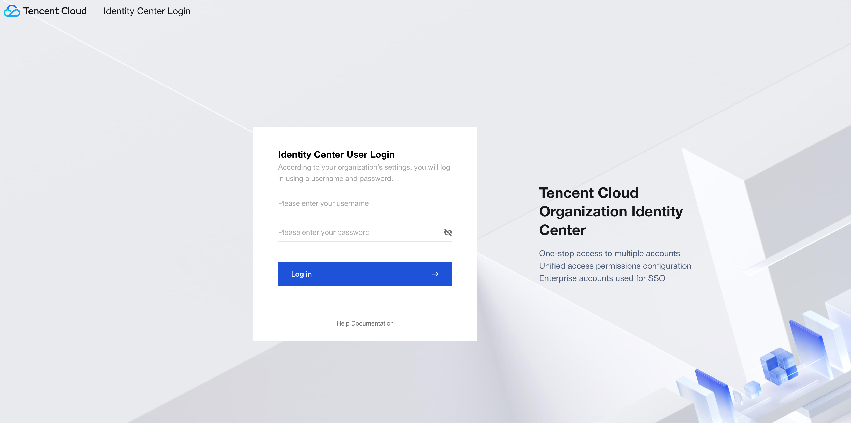 アイデンティティセンターのユーザー名とパスワードを入力し、ログインをクリックします。パスワードを変更する必要がある場合は、ユーザーパスワードのリセットを参照してください。