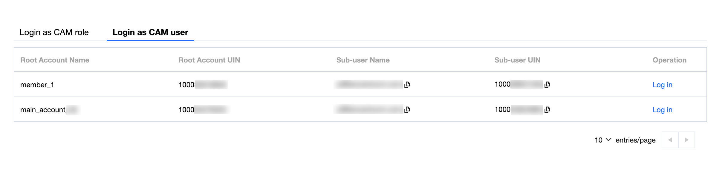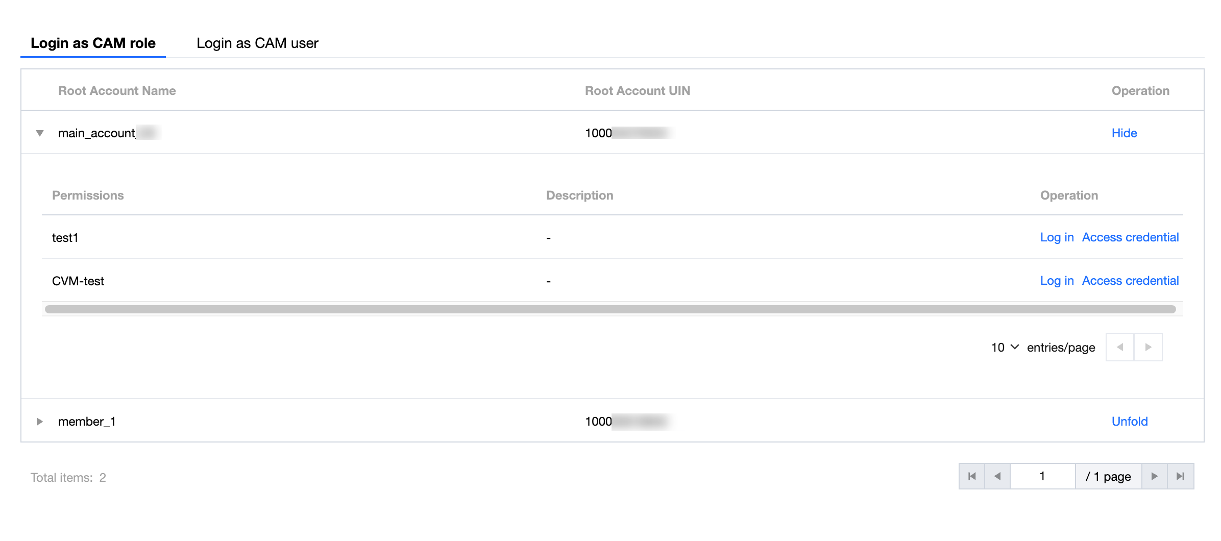 アイデンティティセンターのユーザーがユーザーポータルにログインした後、自身がアクセス権限を持つアカウントを参照でき、CAM ロールまたは CAM ユーザーとしてアカウントの対応するリソースにアクセスできます。