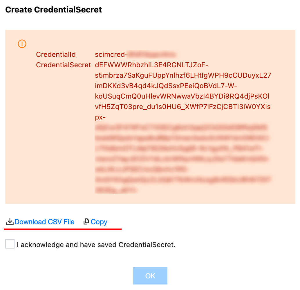 2. CredentialSecretの作成ダイアログで、SCIMキーを保存するには、CSVファイルをダウンロードするかコピーしてください。キーを保存した後、確認をクリックします。