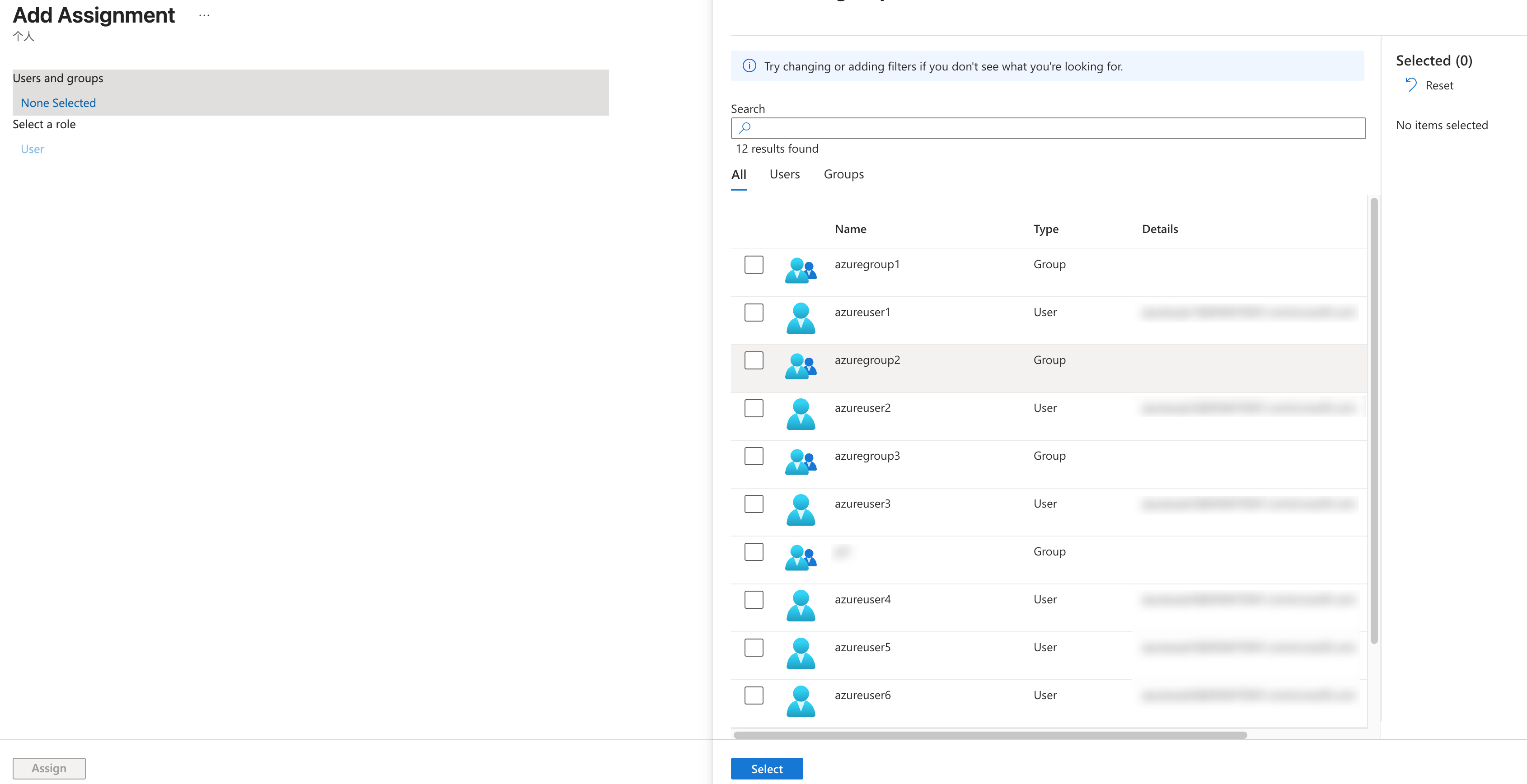 2. 割り当ての追加ページで、ユーザーまたはユーザーグループを選択し、選択をクリックします。