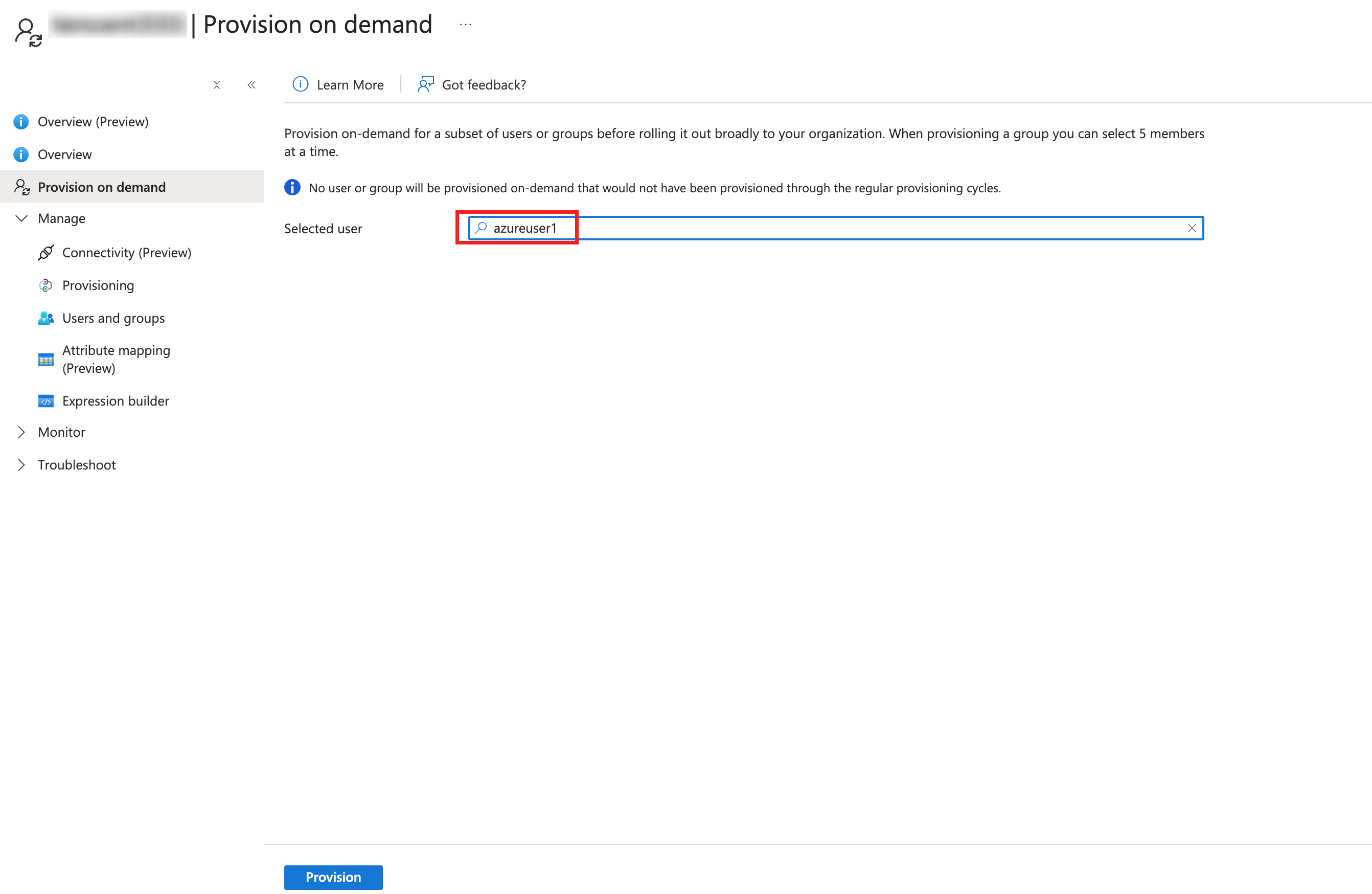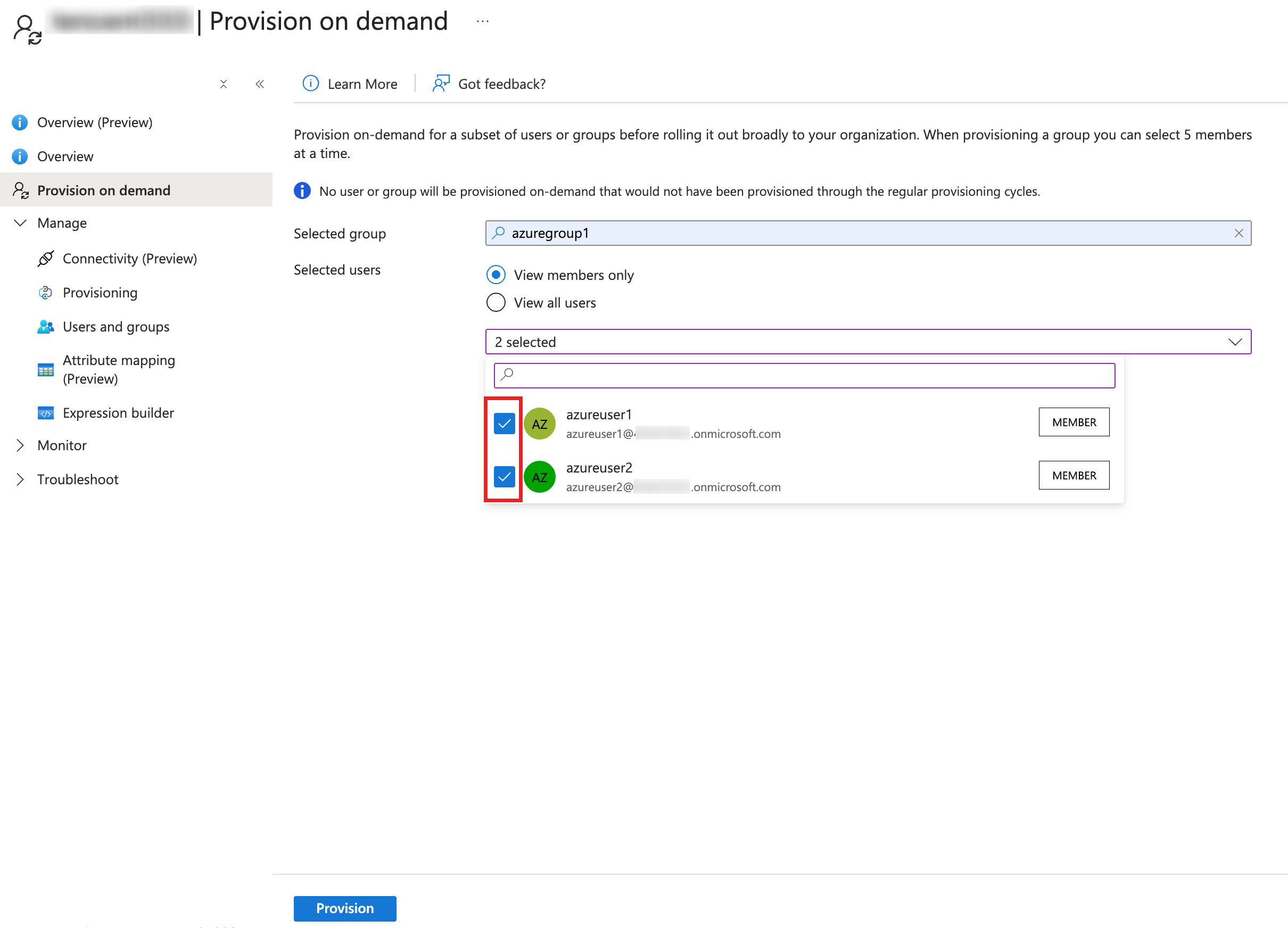 1. オンデマンドプロビジョニングページで、同期が必要なユーザーを選択し、設定をクリックします。