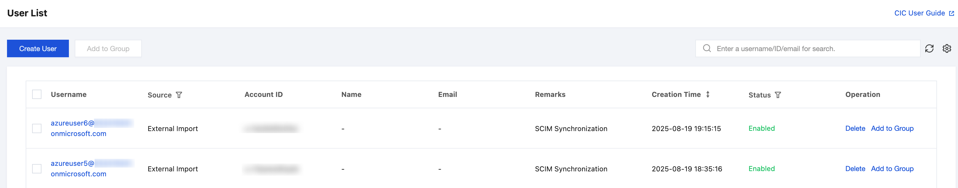 左側のナビゲーションバーで、ユーザー管理 > ユーザーをクリックし、リストを参照できます。ソースは自動的に外部インポートとして識別されます。