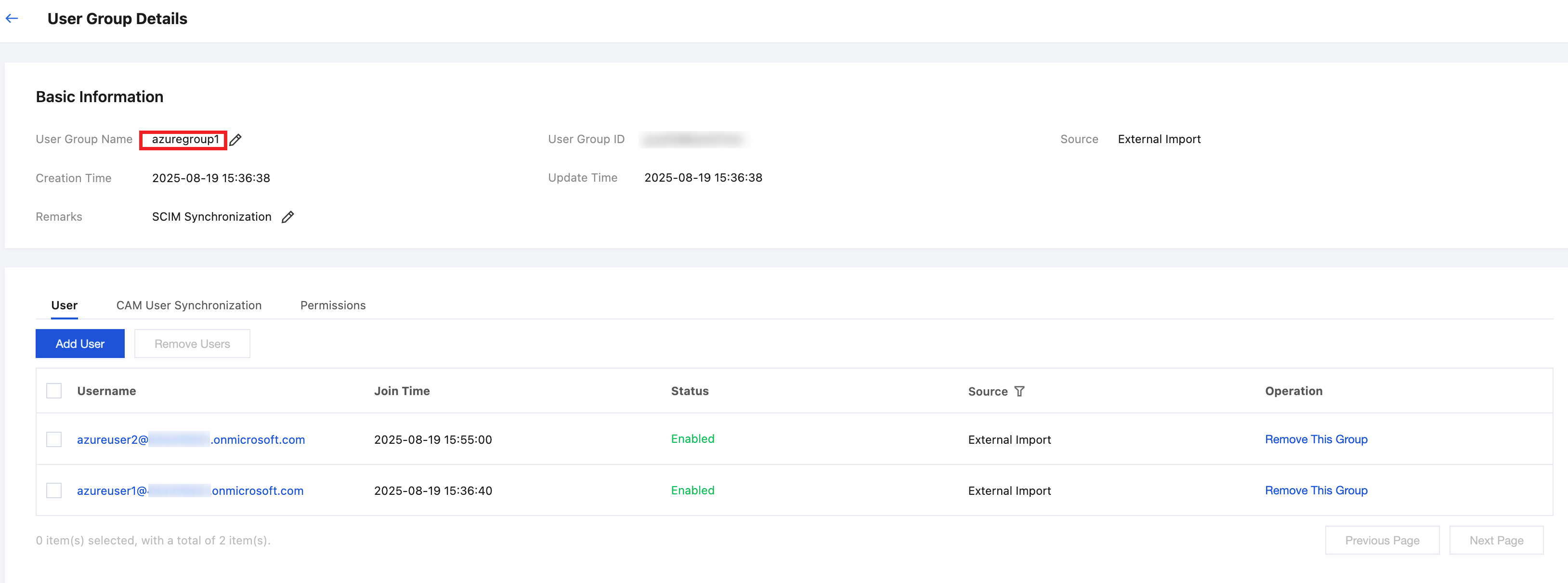 左側のナビゲーションバーで、ユーザー管理 > ユーザーグループをクリックし、リストを表示できます。ソースは自動的に外部インポートとして識別されます。