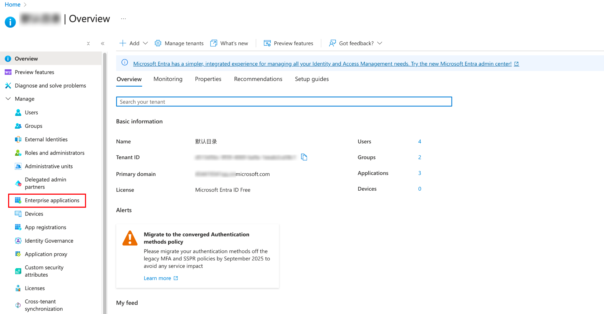 2. 左側のナビゲーションバーで、Microsoft Entra IDを選択します。 3. 左側のナビゲーションバーで管理 > 企業アプリケーションを選択した後、すべてのアプリケーションに移動します。 4. 新しいアプリケーションを作成をクリックします。