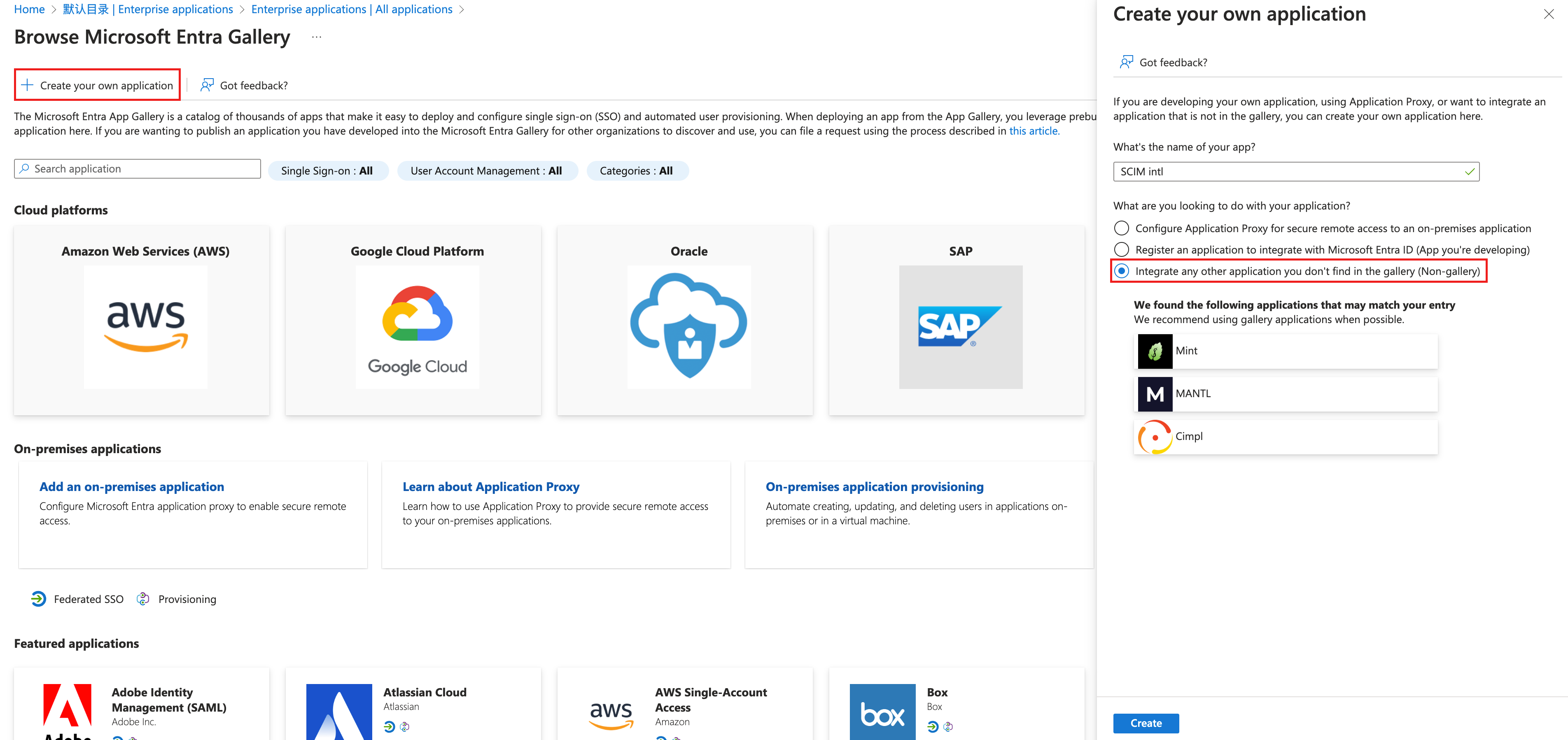 5. Microsoft Entraギャラリーを参照ページで、独自のアプリケーションを作成をクリックし、右側のウィンドウでアプリケーション名を入力し、ギャラリーにないその他のアプリケーションを統合する(非ギャラリー)を選択してから、作成をクリックします。