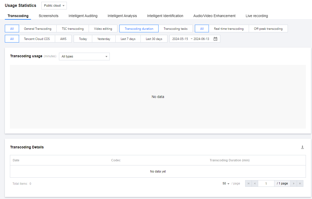 このページでは、MPSのパブリッククラウド使用量データを統計しており、音声・動画トランスコード、スクリーンショット、スマート審査、インテリジェント分析などのタスクタイプにおけるデータ統計が含まれます。