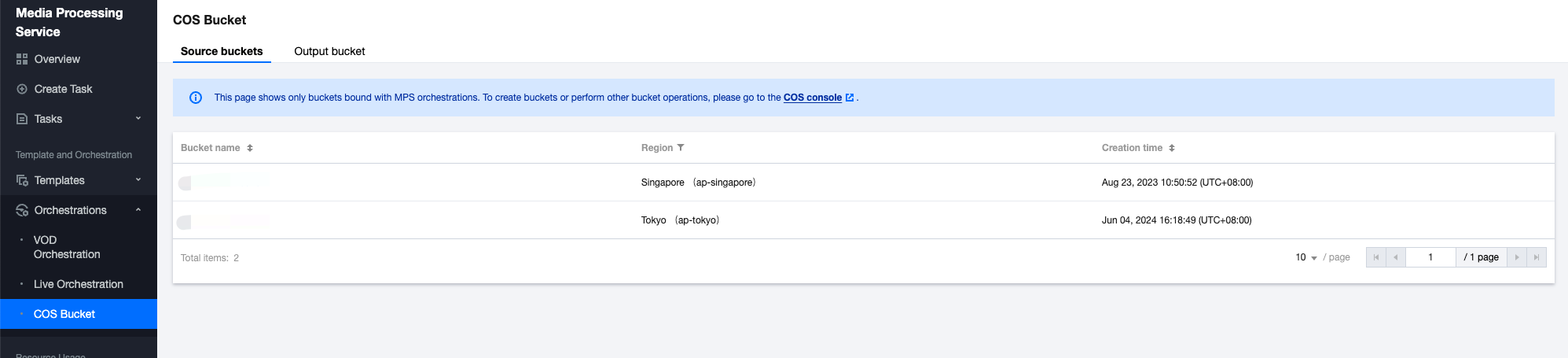 このページのバケットはMPS製品サービスで使用されているものに限定されます。バケットの作成やより詳細な操作については、COSコンソールで行ってください。