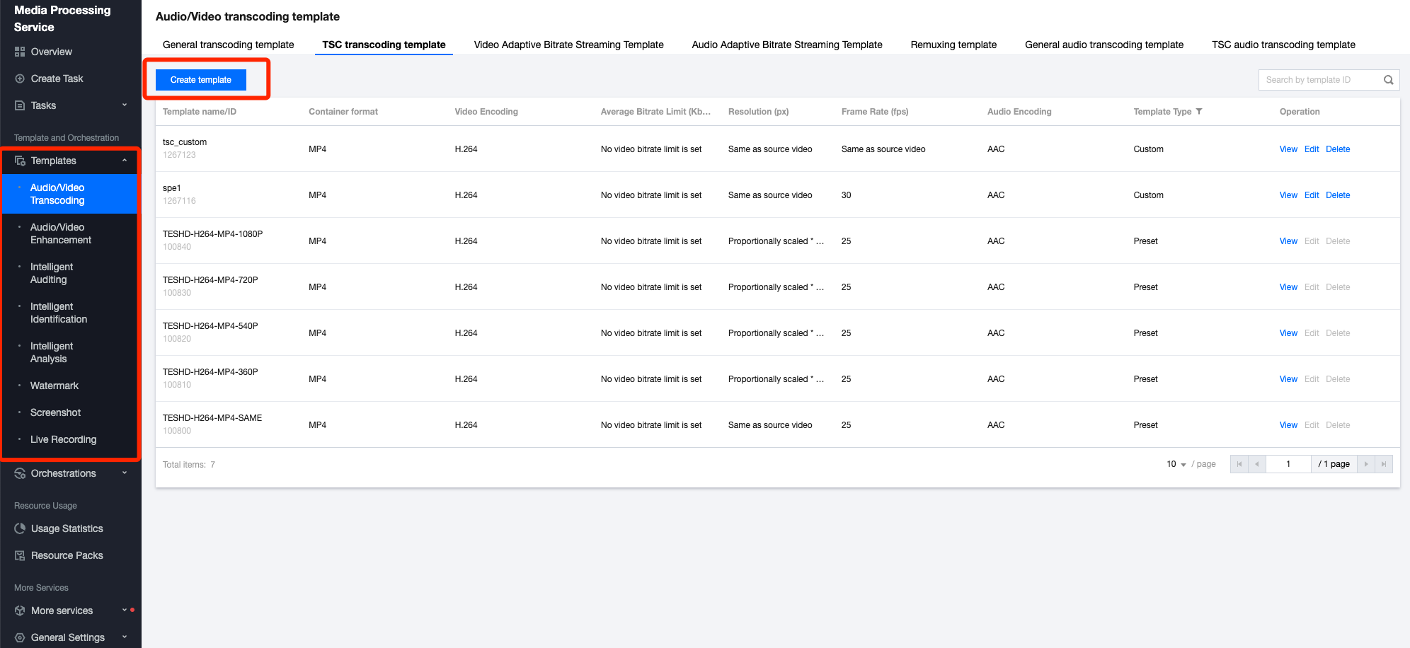 音声・動画トランスコードテンプレート | TSCテンプレート | 標準動画トランスコードと比較して、TSCは画質を維持しながら、動画ファイルサイズを大幅に圧縮できます。 |