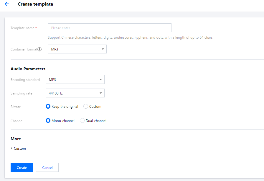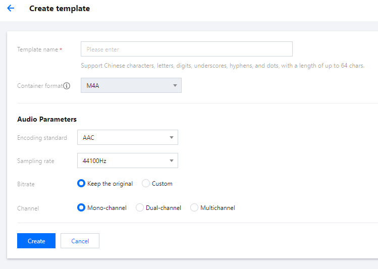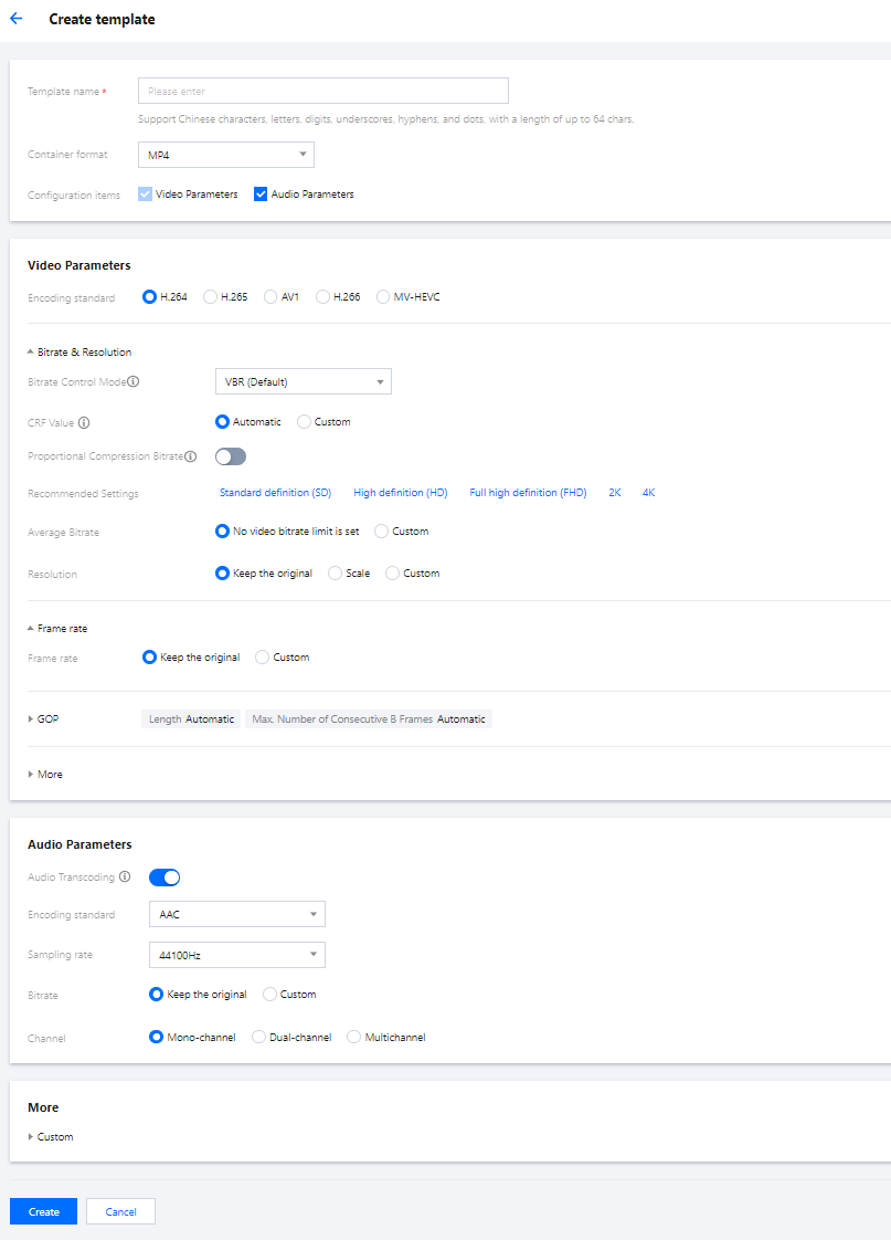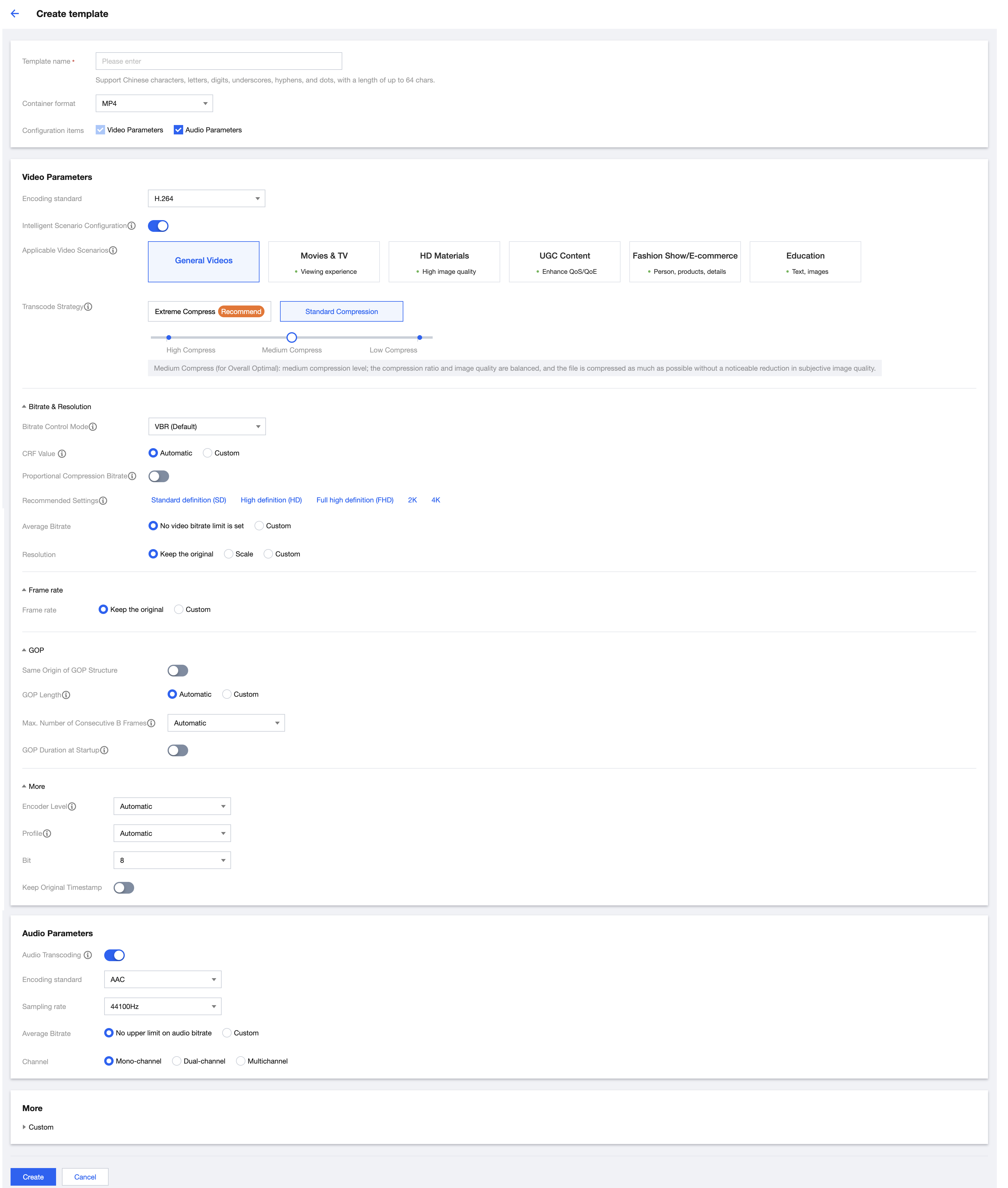 音声パラメータ | 基本設定 | 音声トランスコード、コーデック、サンプリングレート、音声ビットレート、チャンネルが含まれます。 上記の標準動画トランスコードテンプレート→設定項目の詳細説明を参照してください。 | |