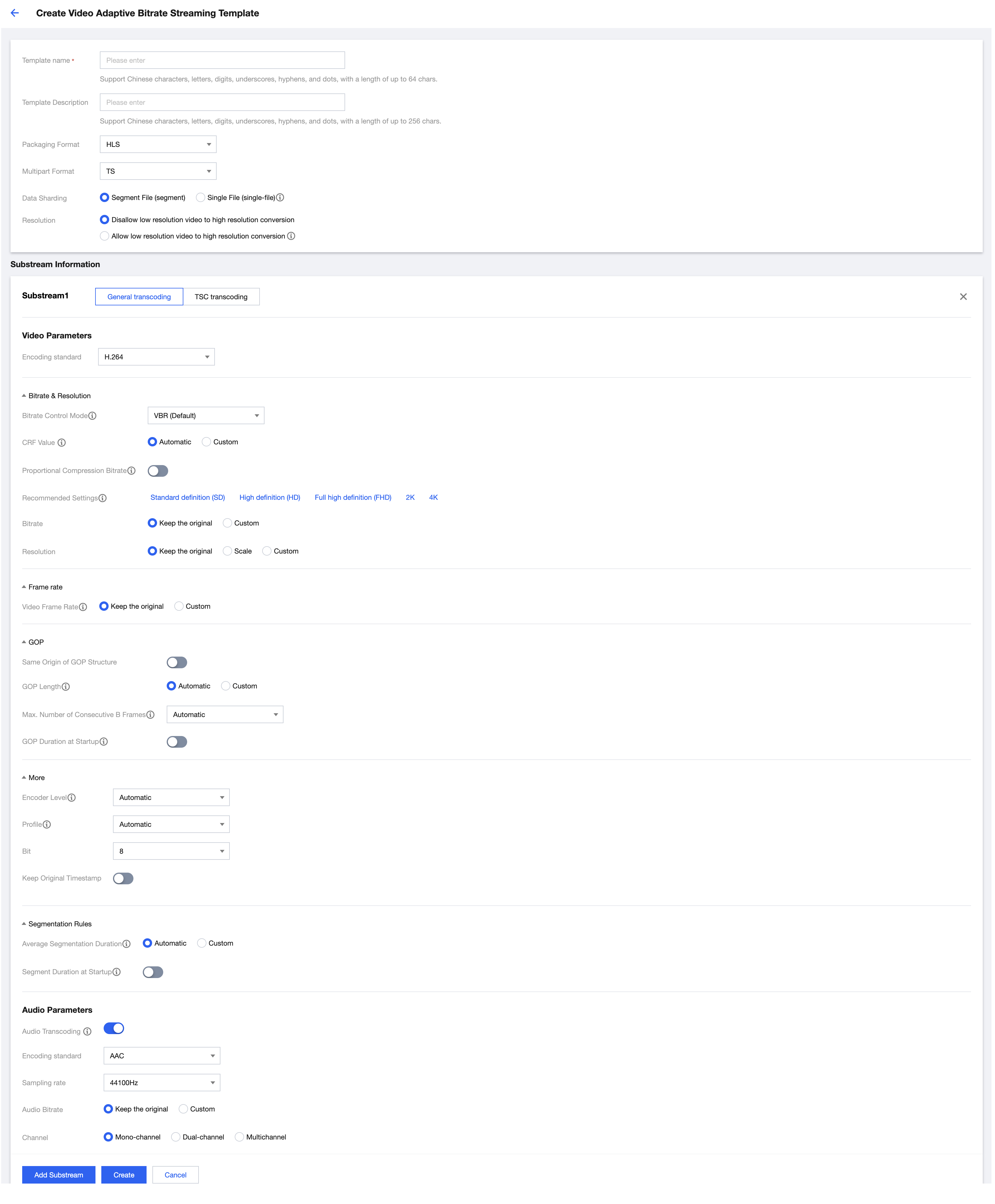 サブストリーム情報 | テンプレート | サブストリームには標準音声トランスコードまたは音声TSCのパラメータを選択します。 |
