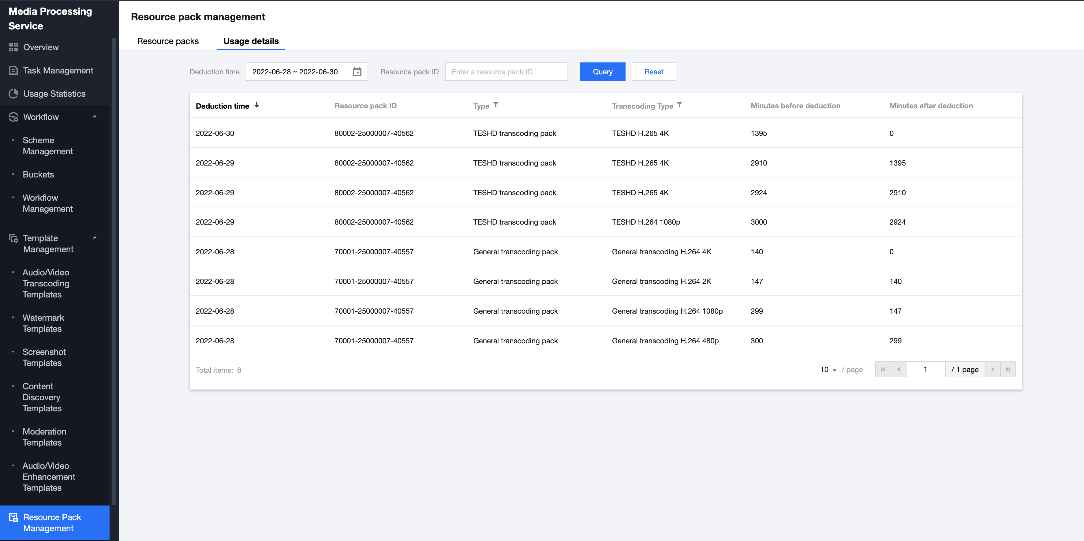 リソースパックタイプ | リソースパックタイプには標準トランスコードリソースパック、TSCトランスコードリソースパックの2種類があり、リストでリソースパックタイプによるフィルタリング機能を利用できます。 |