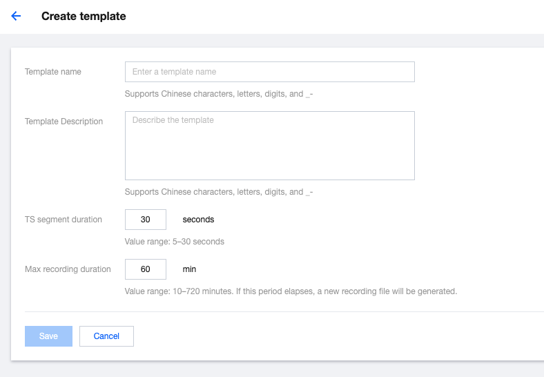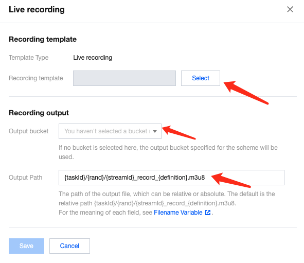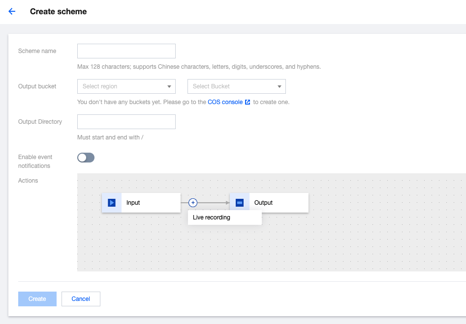 1. ライブ録画テンプレートページで、ライブ録画テンプレートを作成します。コンソールには、デフォルトの録画テンプレートが事前に一つ提供されています。 2. ライブ配信サービスワークフローページで、新しいライブ配信サービスワークフローを作成します。ページ内でCOSストレージのバケットを選択し、録画ファイルの出力結果を保存するディレクトリを記述する必要があります。下部のタスク設定フローチャートで、中央のプラス記号をクリックし、「ライブ録画」ステップを追加します。 3. 追加したライブ録画ステップの右側にある編集ボタンをクリックし、このステップの詳細設定を行います。
