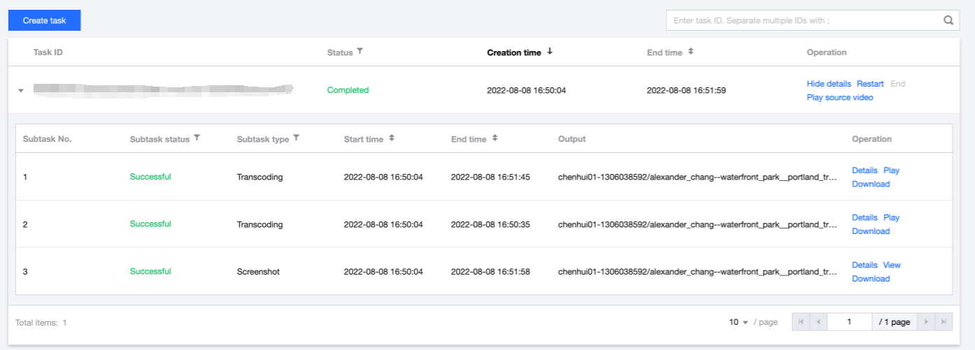 ダウンロード | ダウンロードをクリックして出力ファイルをダウンロードできます。音声・動画トランスコード、スクリーンショット、音声・動画強化タイプのサブタスクのみダウンロード可能です。 注意:現在、複数スクリーンショットがある場合、最初の1枚のみダウンロード可能です。一括ダウンロード機能は今後で追加する予定です。 |