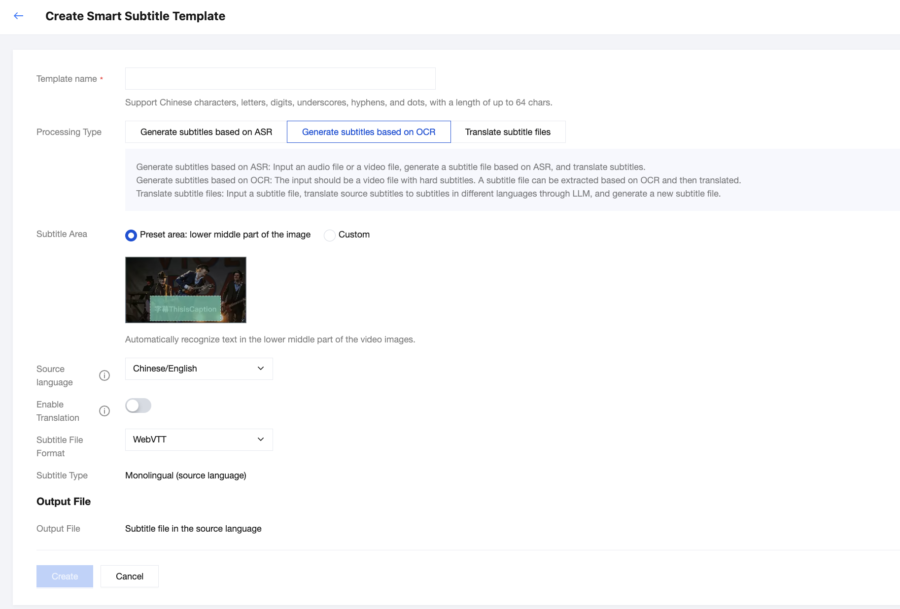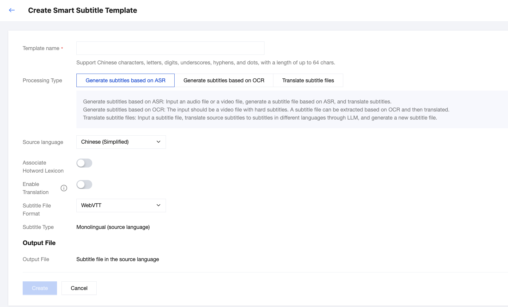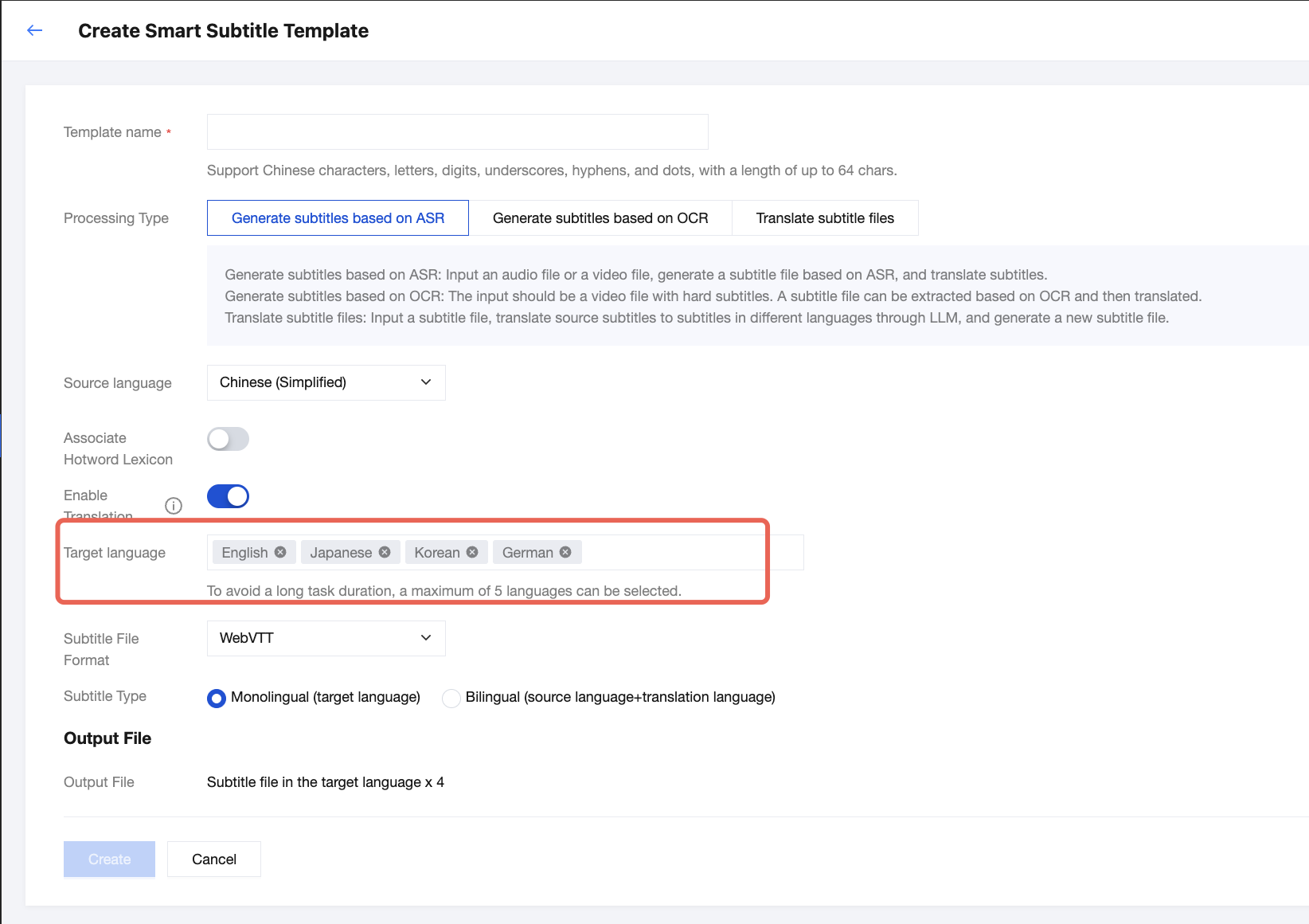 字幕タイプ | 翻訳機能を有効にしなかった場合、出力される字幕にはソース言語の内容のみが含まれます。 翻訳機能を有効にした場合、以下の字幕タイプをサポートしています。 単一言語(ターゲット言語) 二ヶ国語(ソース言語 + ターゲット言語) | |
