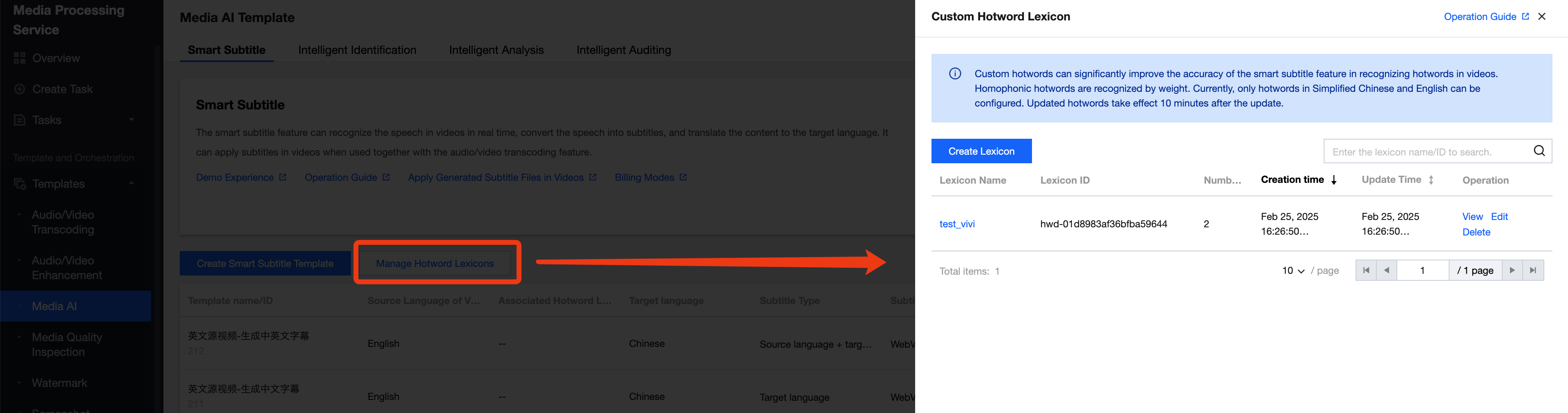 1. テンプレート管理 > メディアAIテンプレート > スマート字幕に移動し、スマート字幕テンプレートのリストページでカスタムホットワード用語集の管理をクリックして、カスタムホットワード用語集を開きます。