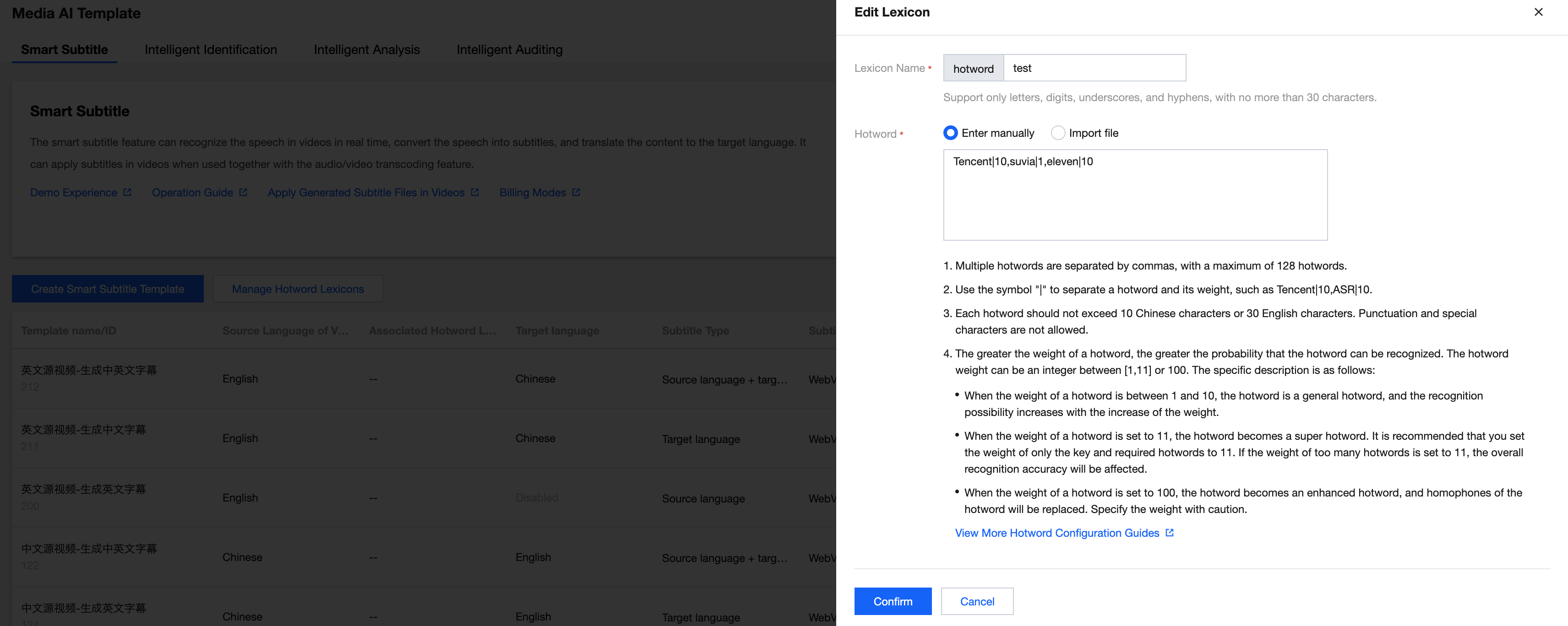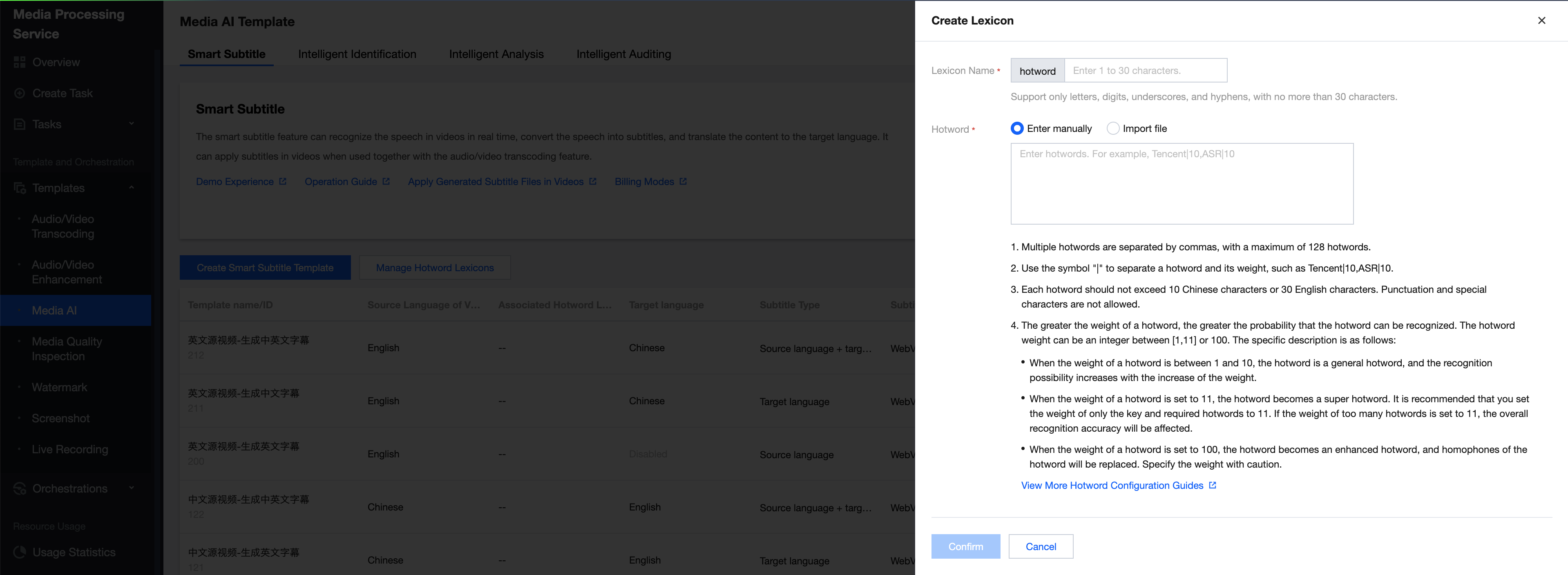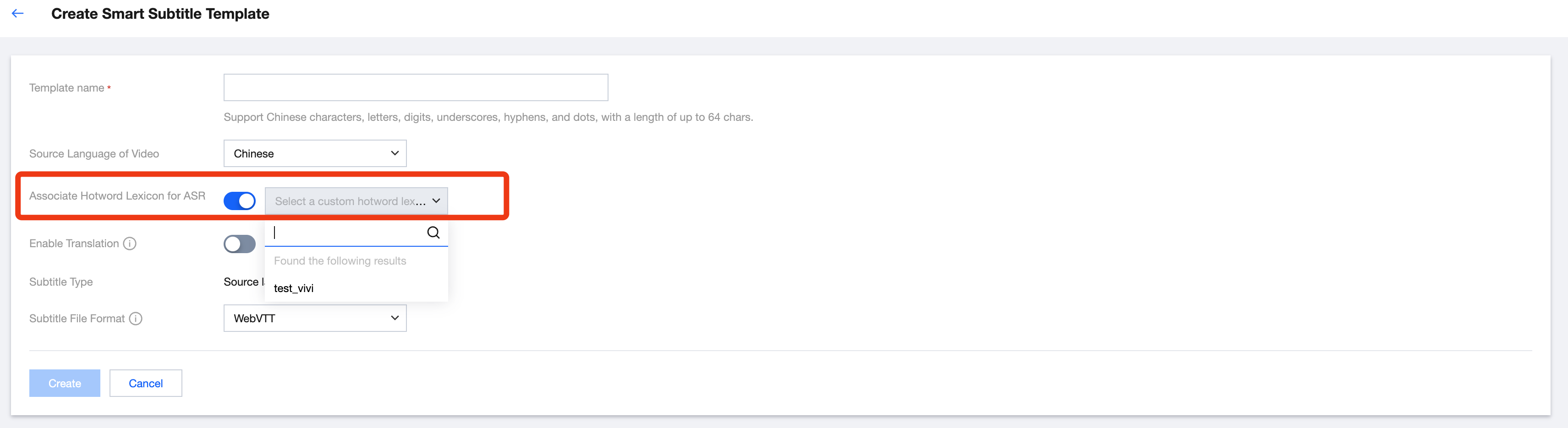 スマート字幕テンプレートのドキュメントを参照し、テンプレート設定で音声認識のホットワードとの関連付け機能を有効にし、作成したカスタムホットワード用語集を選択します。 注意: