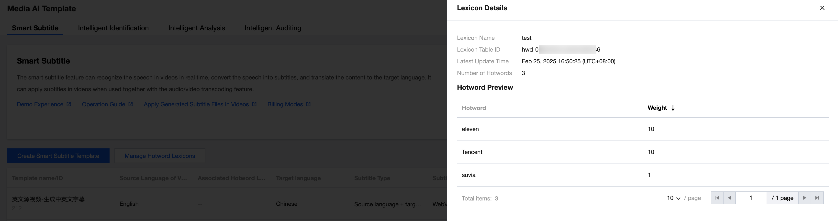 スマート字幕テンプレート > カスタムホットワード用語集の管理に移動し、用語集の操作列にある表示をクリックすると、用語集の詳細をプレビューできます。