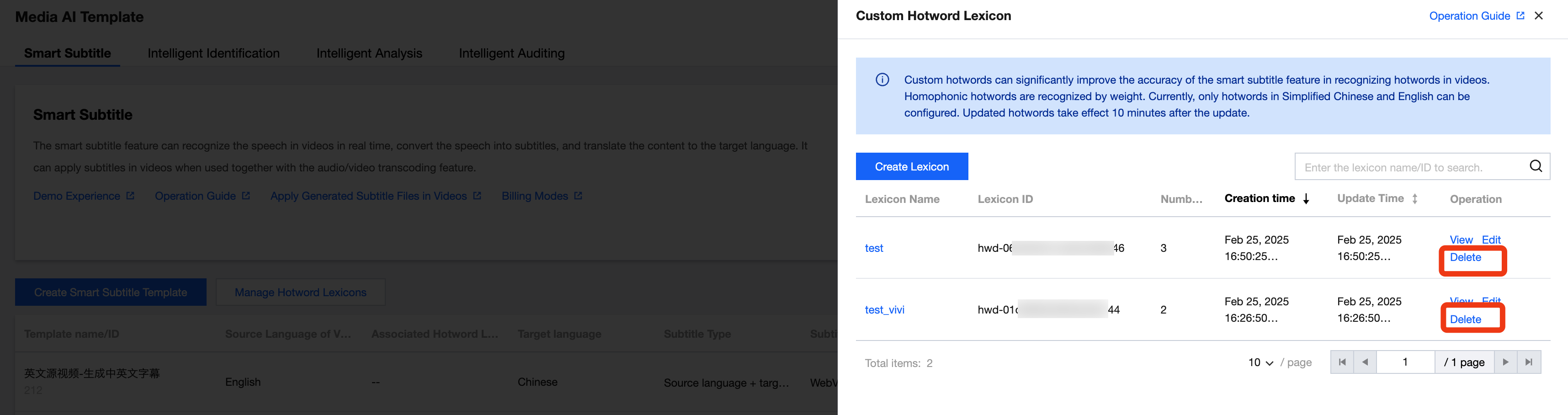 カスタムホットワード用語集ページで、操作したい用語集を選択し、右側の削除をクリックすると、その用語集を削除できます。
