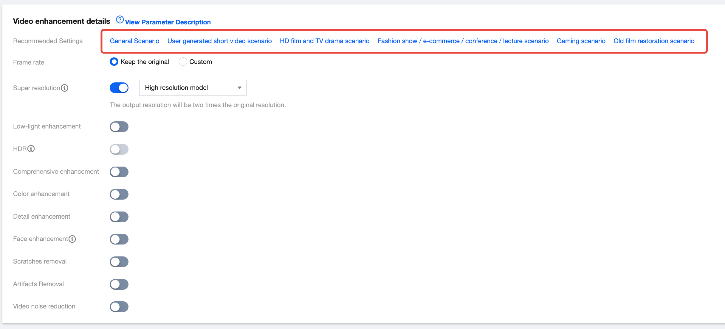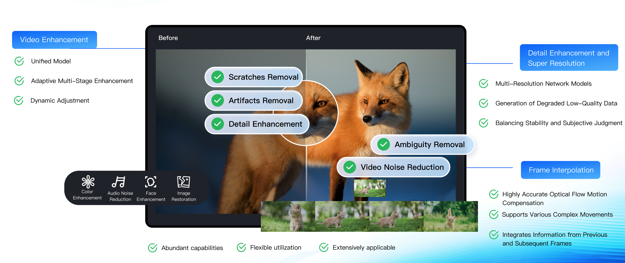 動画強化 | 超解像度 | 超解像技術は動画の内容と輪郭を識別し、ディテールと局所的な特徴を高精細に再構築することで、低解像度の動画を高解像度の動画に変換します。古い映像の修復などに適しています。 |