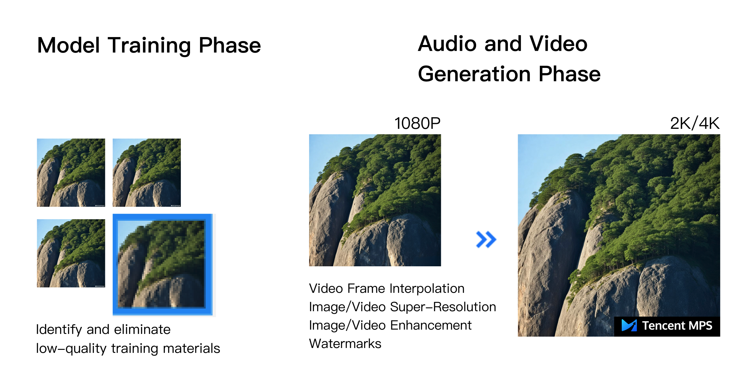 音声・動画強化 | 音声・動画強化機能は、動画のぼかし除去、ノイズリダクション、ディテール強化、文字補強、色調補正、顔補正、動画超解像、フレーム補間などの機能を提供します。 大規模言語モデルによる動画生成において、元々生成された720Pまたは1080P解像度の動画を、超解像技術によって2Kや4K解像度に高めるとともに、フレーム補間、ディテール強化、色調補正などの機能で画面品質をさらに向上させることができます。 | |