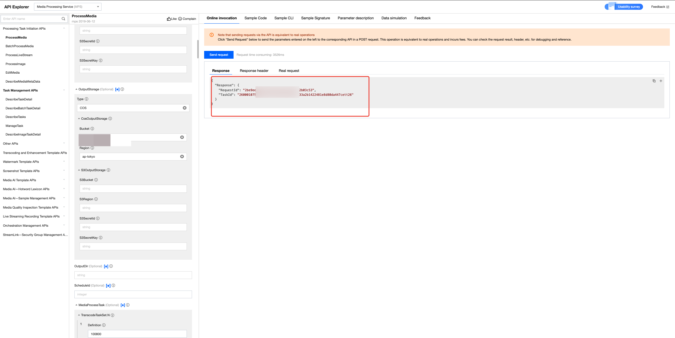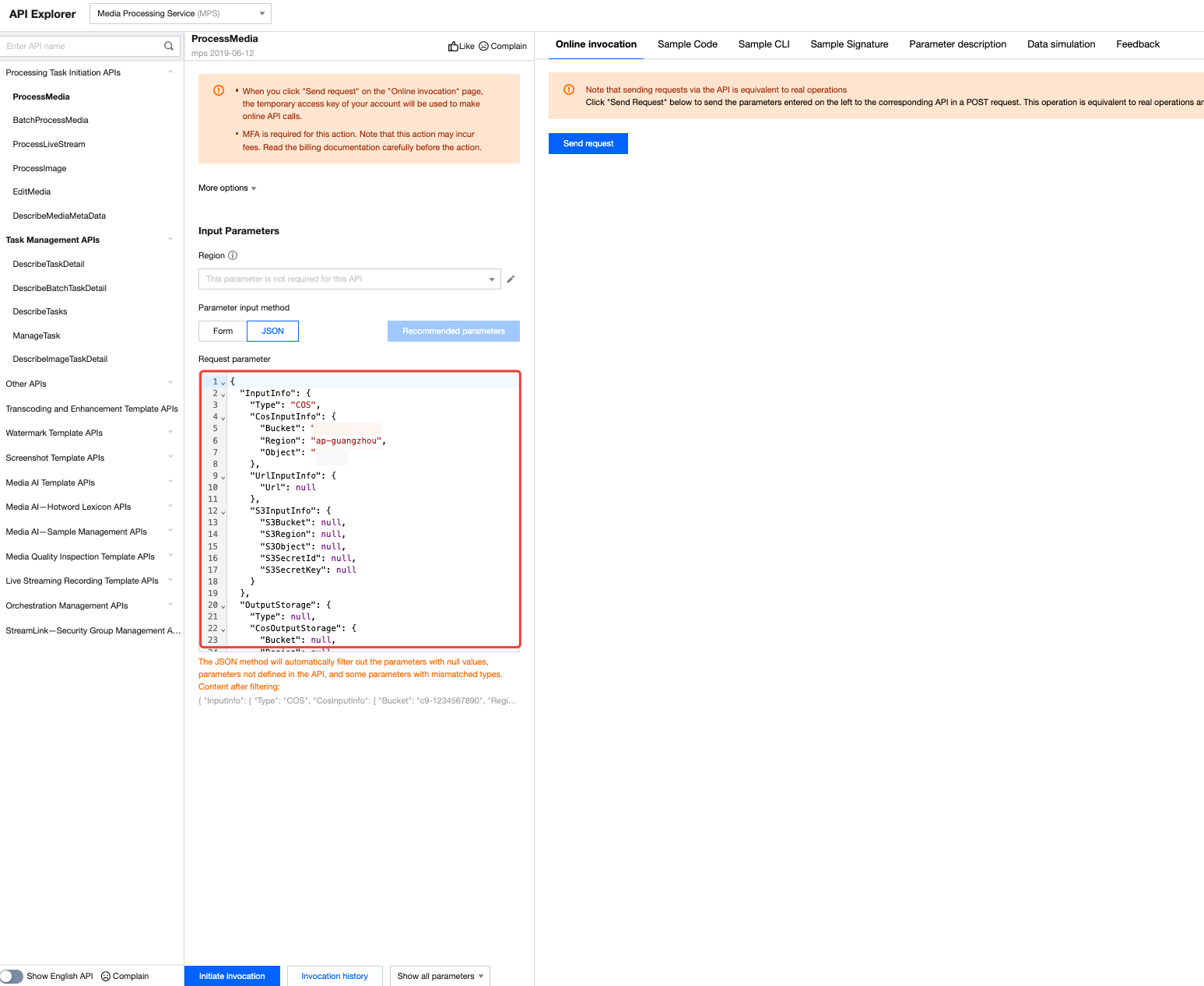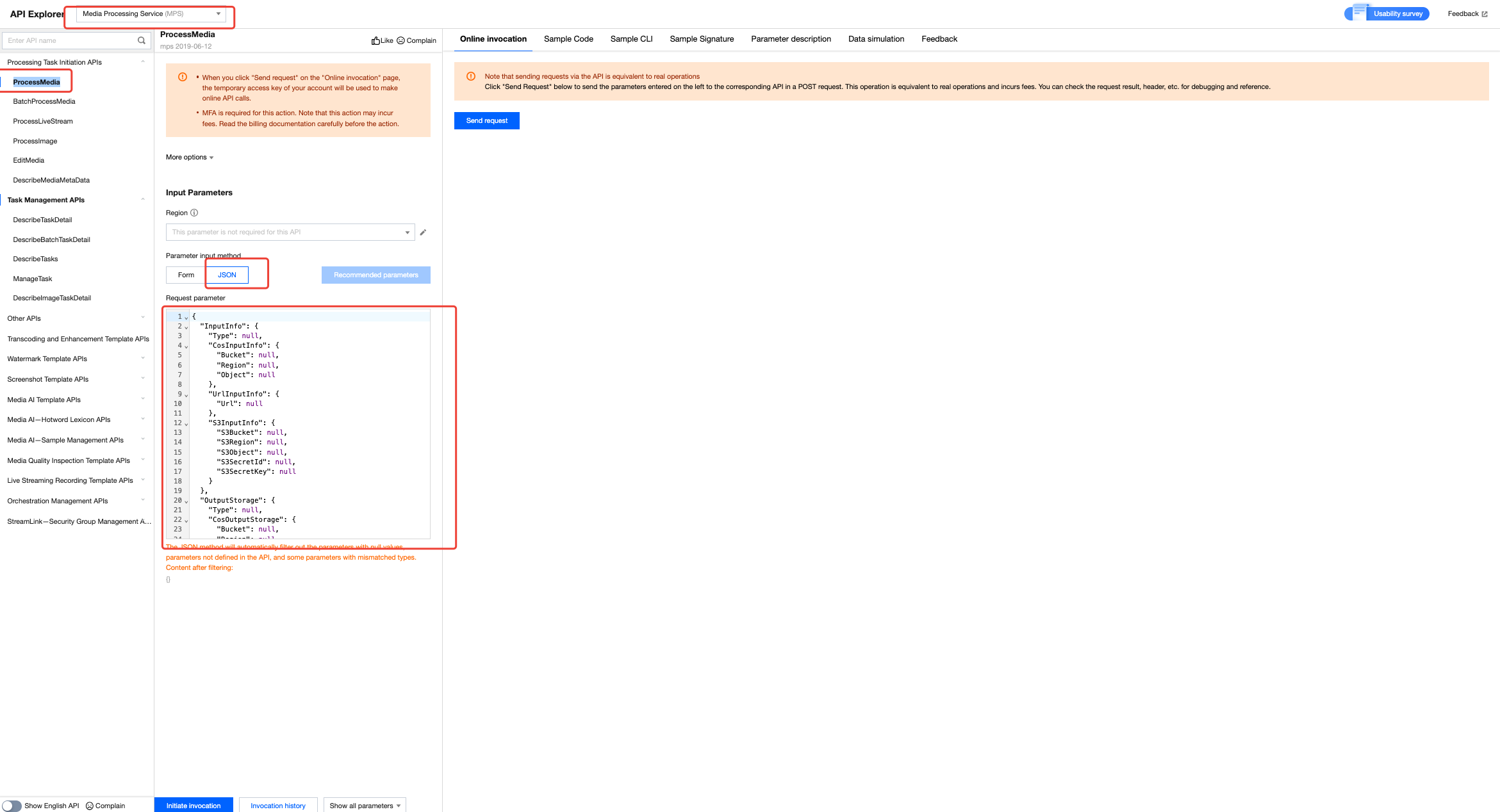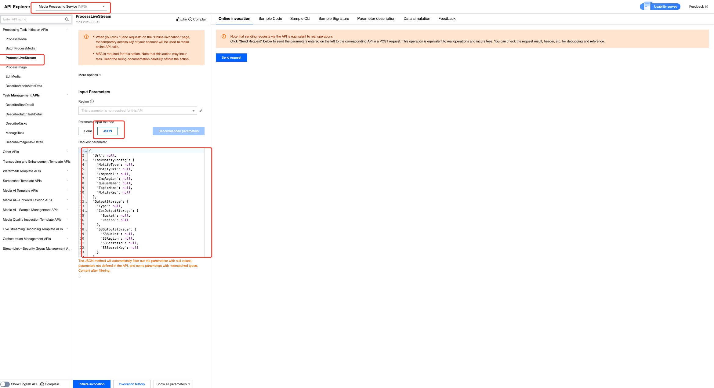 API Explorerページで、「MPS」を選択し、メディア処理タスク関連API > ライブストリーム処理 > JSON の順にクリックして、対応する入力パラメータのテキストボックスを見つけます。 ステップ3:JSONコードの入力と呼び出しの開始