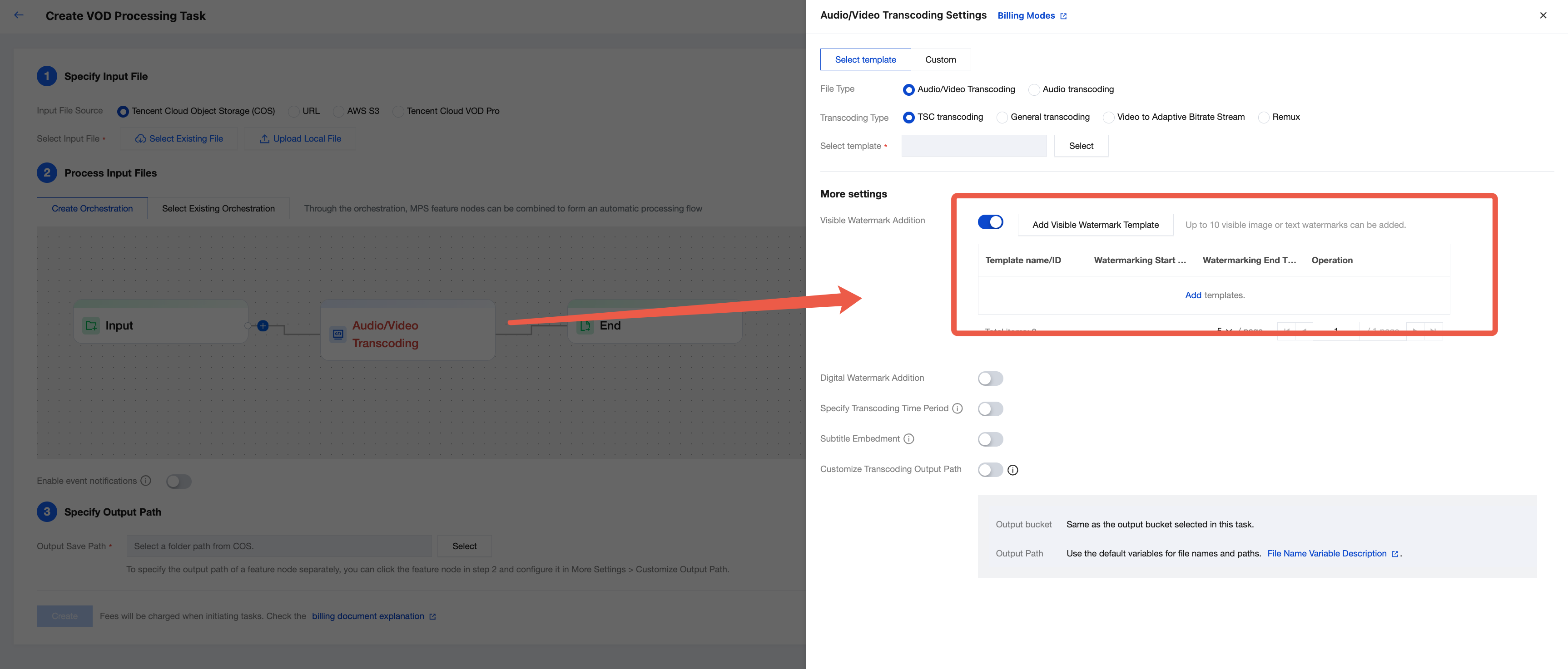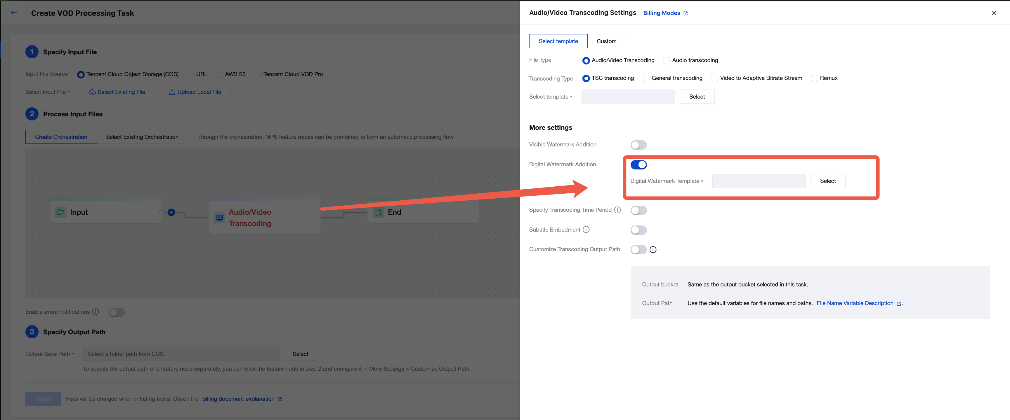 {"InputInfo": {"Type": "URL","UrlInputInfo": {"Url": "https://test-1234567.cos.ap-guangzhou.myqcloud.com/video/test.mp4"// 処理したいビデオのURLに置き換えてください}},"OutputStorage": {"Type": "cos","CosOutputStorage": {"Bucket": "test-1234567","Bucket": "test-1234567",}},"MediaProcessTask": {"TranscodeTaskSet": [{"Definition": 101005, //101005はプリセットの動画トランスコードテンプレートIDです。コンソールで作成したカスタム音声・動画トランスコードテンプレートIDに置き換え可能です"WatermarkSet": [{"Definition": 1234 //コンソールで作成したカスタム電子透かしテンプレートIDを記入します。1234は単なる例です}]}]}}