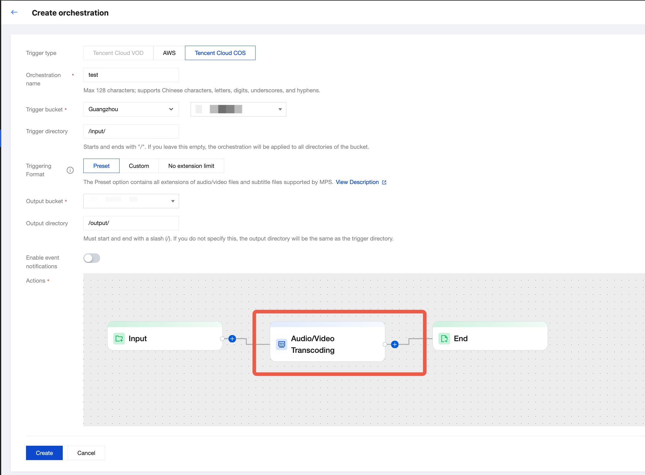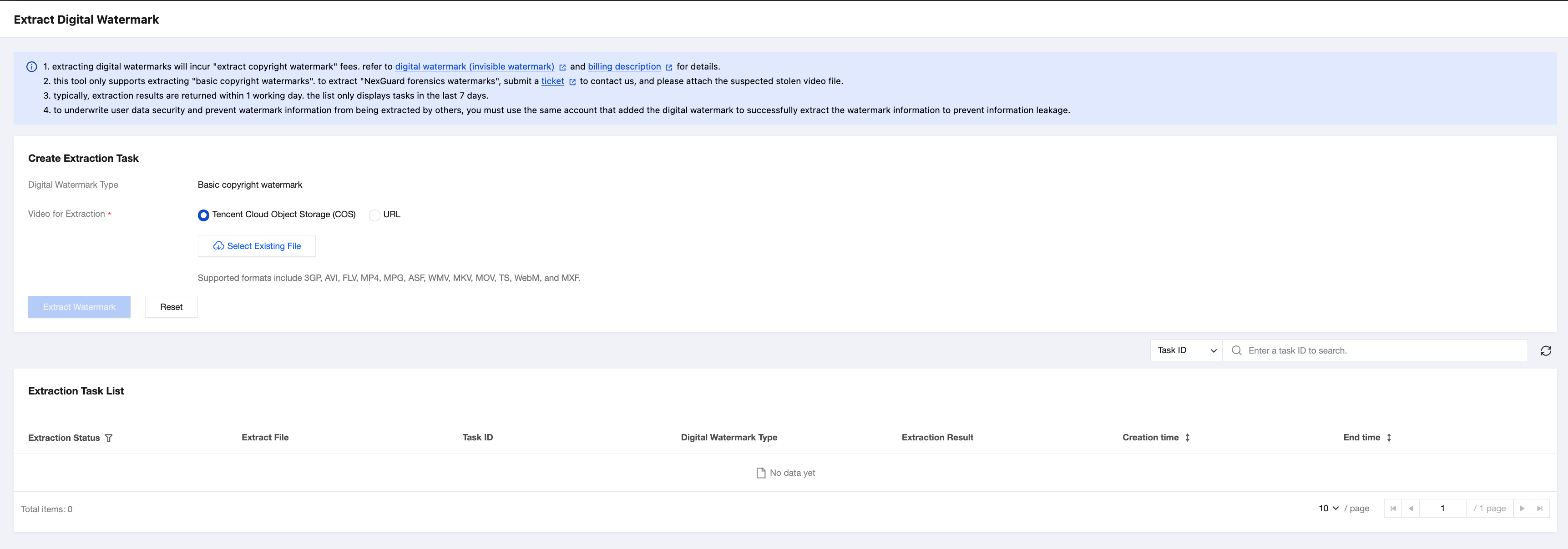 {"InputInfo": {"Type": "URL","UrlInputInfo": {"Url": "https://test-1234567.cos.ap-guangzhou.myqcloud.com/video/test.mp4"// 処理したいビデオのURLに置き換えてください}},"OutputStorage": {"Type": "cos","CosOutputStorage": {"Bucket": "test-1234567","Bucket": "test-1234567",}},"MediaProcessTask": {"TranscodeTaskSet": [{"Definition": 101005, //101005はプリセットの動画トランスコードテンプレートIDです。コンソールで作成したカスタム音声・動画トランスコードテンプレートIDに置き換え可能です"BlindWatermark": {"Definition": "1234" //コンソールで作成したカスタム電子透かしテンプレートIDを記入します。1234は単なる例です}}]}}