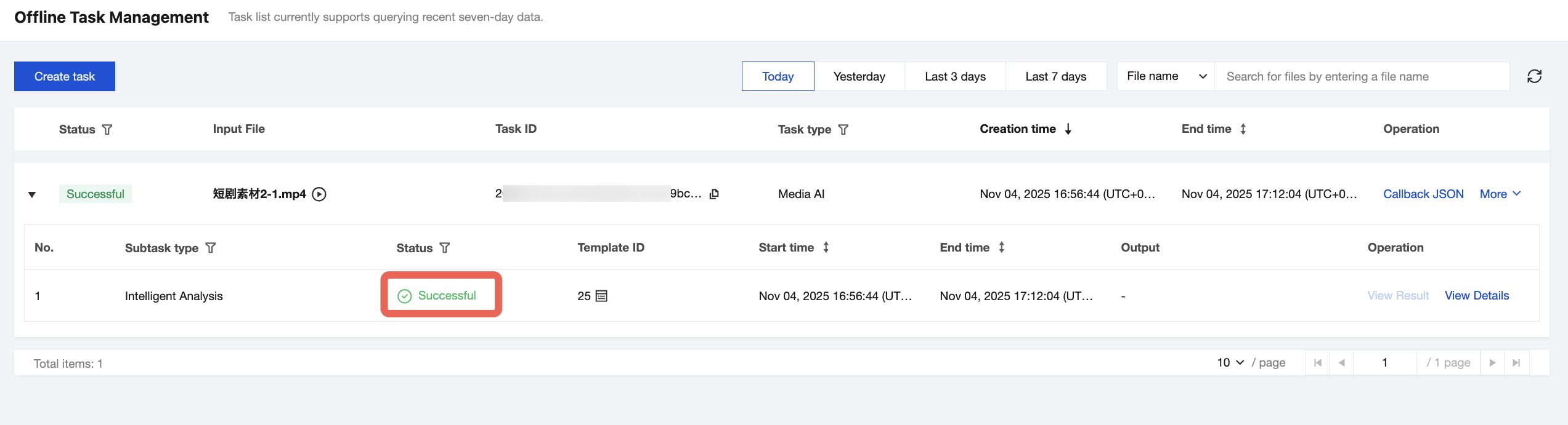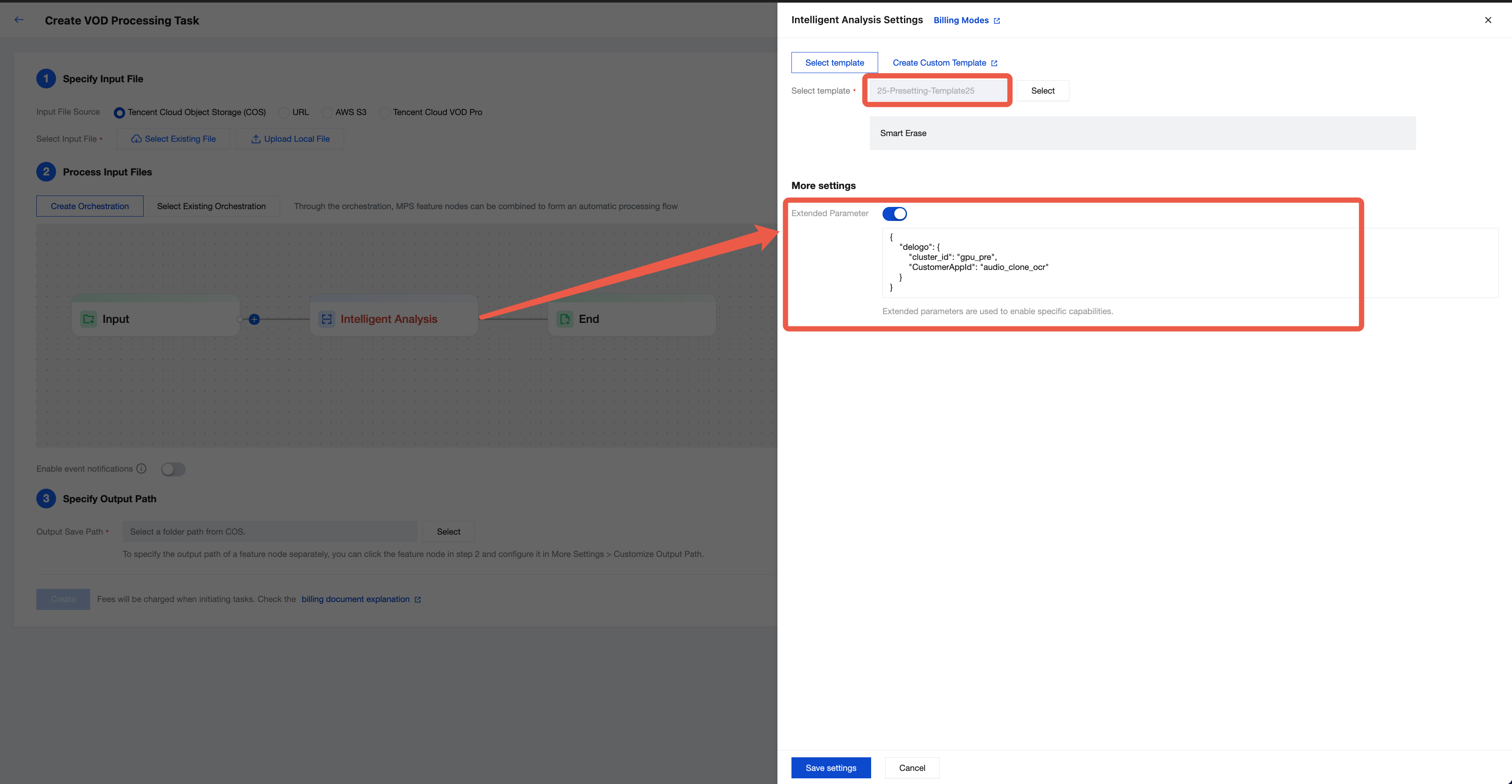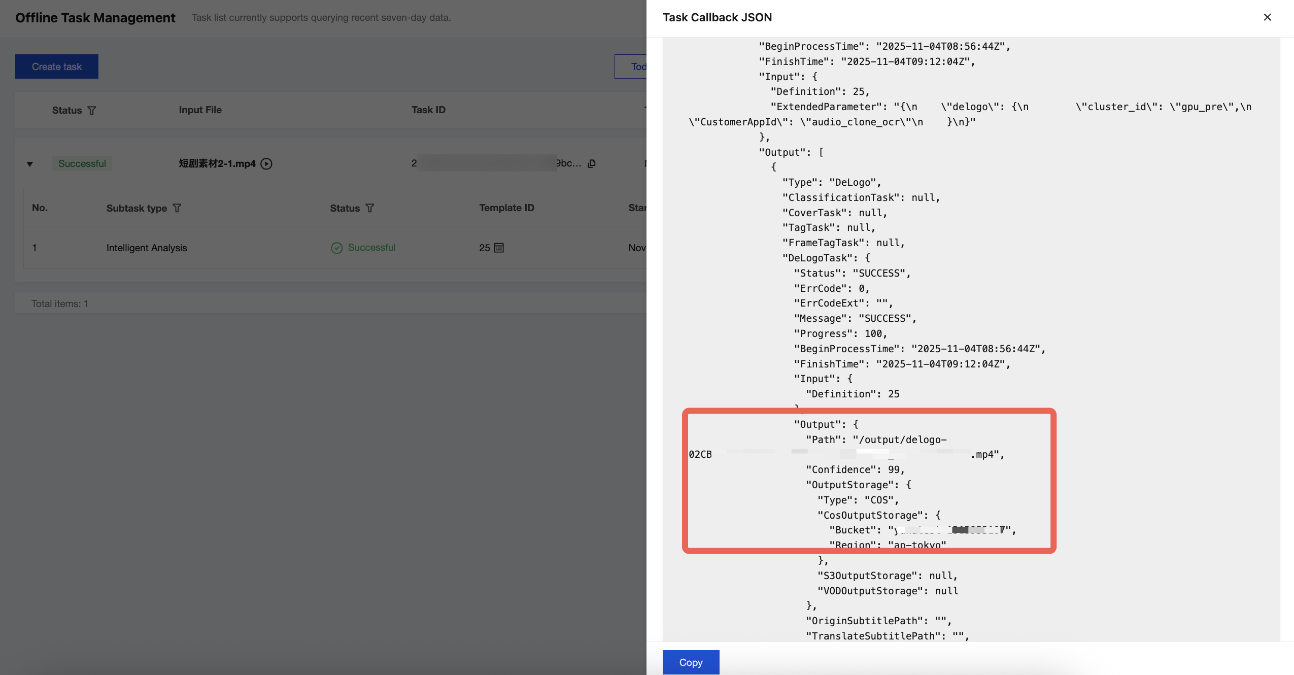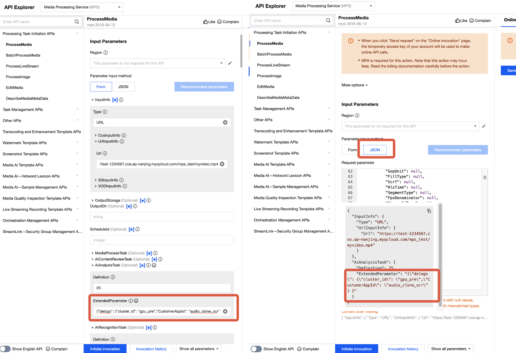 {"InputInfo":{ //入力動画パスで、オリジナル動画に置き換えてください"Type":"URL","UrlInputInfo":{"Url":"https://test-1234567.cos.ap-nanjing.myqcloud.com/mps_test/myvideo.mp4"}},"OutputStorage":{ //出力COSストレージバケットで、置き換えてください"Type":"COS","CosOutputStorage":{"Bucket":"test","Region":"ap-nanjing"}},"OutputDir":"/mps_test/output/",//出力フォルダパスで、置き換えてください""AiAnalysisTask":{"Definition":25, //プリセットテンプレートIDで、25とご入力ください"ExtendedParameter":"{\\"delogo\\":{\\"cluster_id\\":\\"gpu_pre\\",\\"CustomerAppId\\":\\"audio_clone_ocr\\"}}" //拡張パラメータで、動画翻訳の具体的な機能を指定するもの},"TaskNotifyConfig":{ //イベントコールバック通知設定、選択項目"NotifyType":"URL","NotifyUrl":"http://www.qq.com/callback"}}