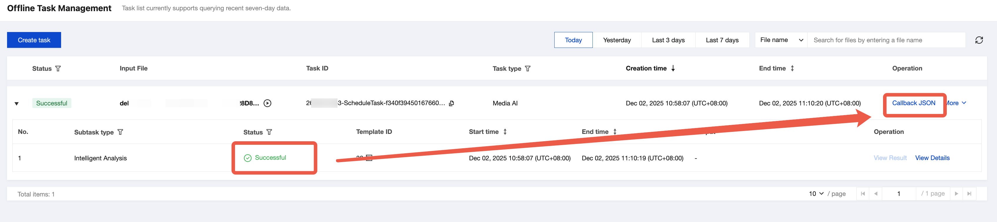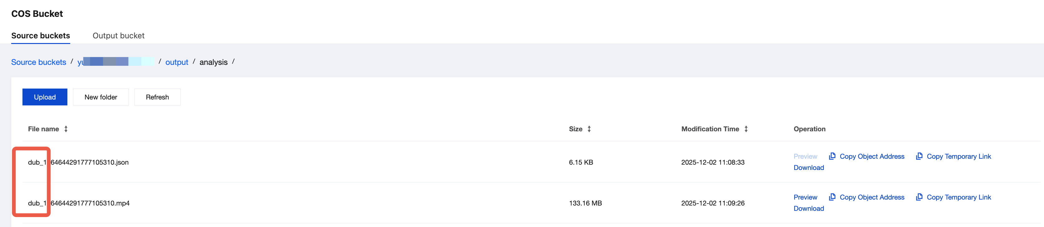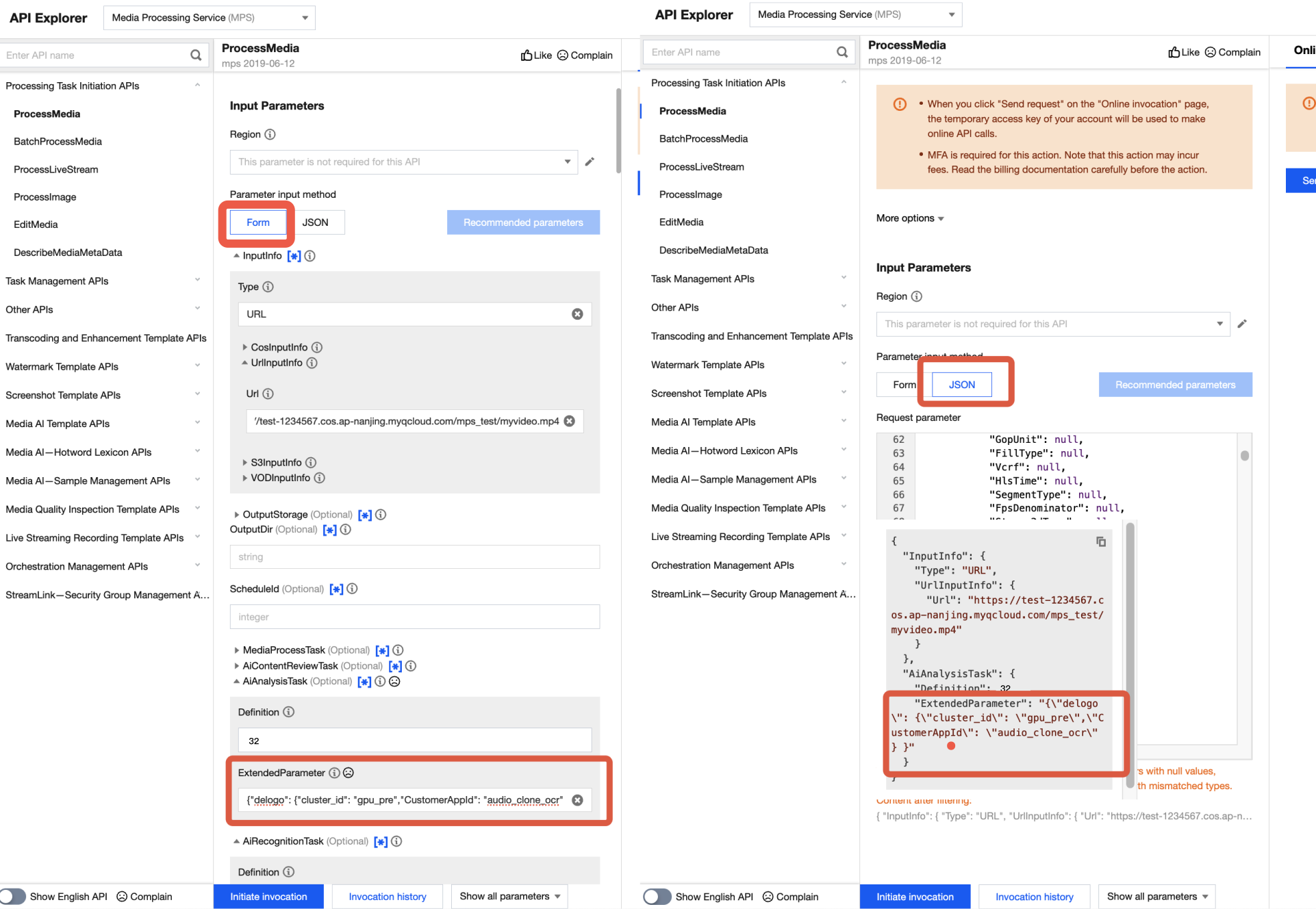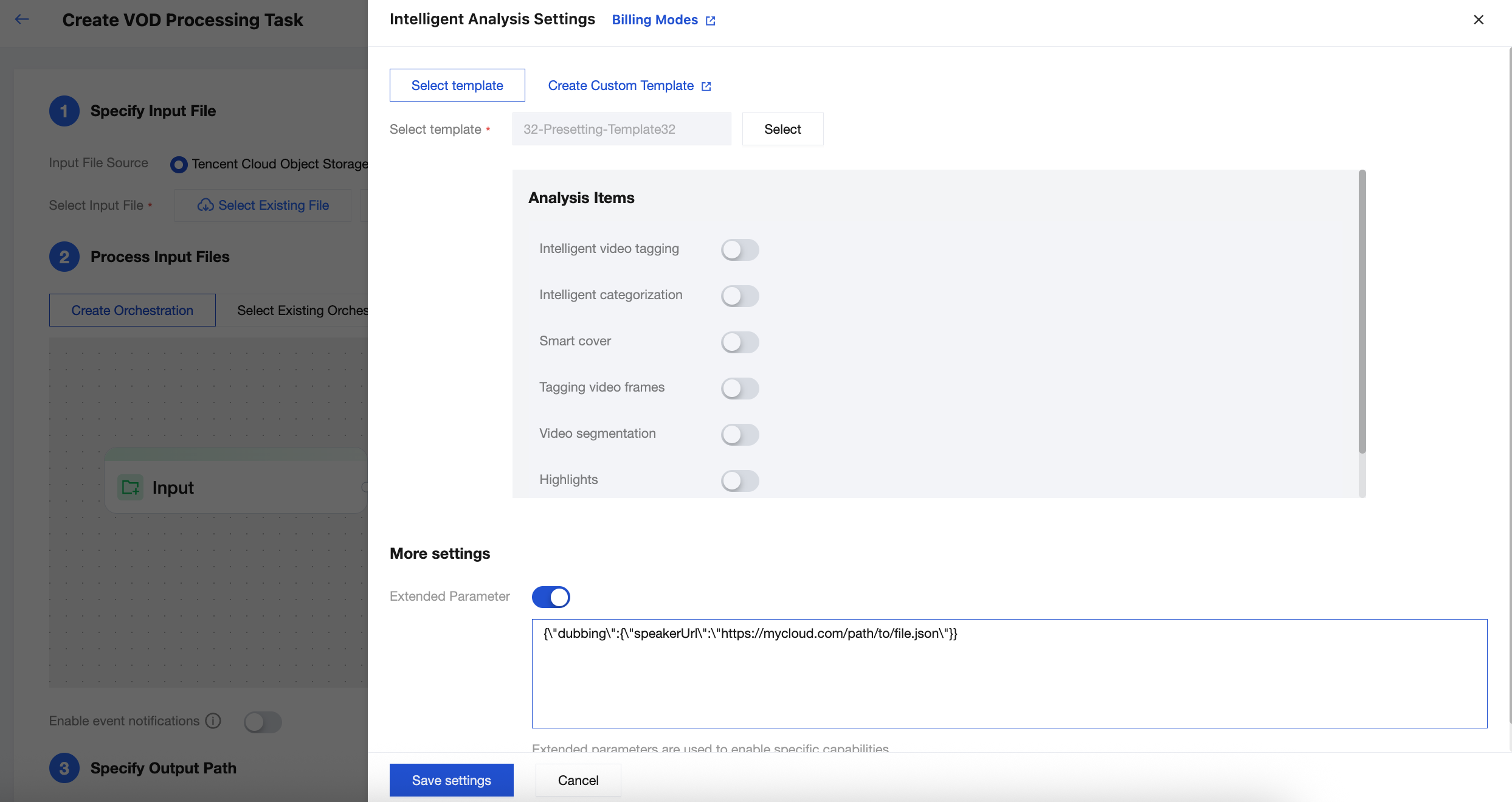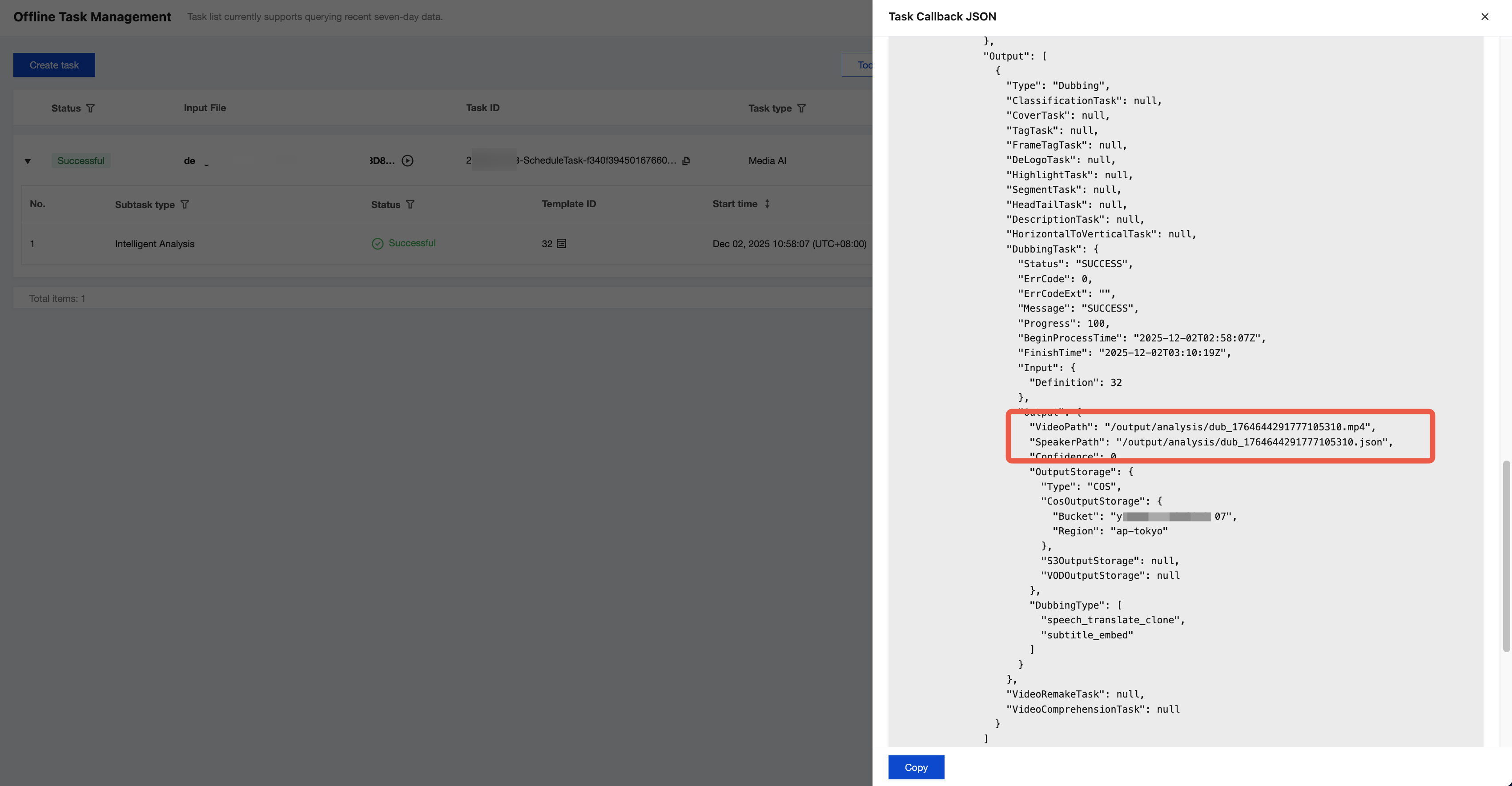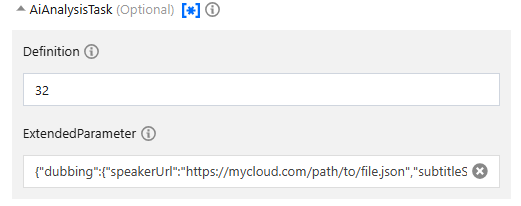 {"InputInfo":{ //入力ビデオパス。ご自身の元のビデオに置き換えてください"Type":"URL","UrlInputInfo":{"Url":"https://test-1234567.cos.ap-nanjing.myqcloud.com/mps_test/myvideo.mp4"}},"OutputStorage":{ //出力先のCOSバケット。置き換えてください"Type":"COS","CosOutputStorage":{"Bucket":"test","Region":"ap-nanjing"}},"OutputDir":"/mps_test/output/",//出力先のフォルダパス。置き換えてください"AiAnalysisTask":{"Definition":32, //プリセットテンプレートIDで、32とご入力ください"ExtendedParameter":"{\\"dubbing\\":{\\"speakerUrl\\":\\"https://mycloud.com/path/to/file.json\\"}}" //拡張パラメータ。必須。speakerファイルパス、字幕スタイルなどのパラメータ指定に使用},"TaskNotifyConfig":{ //イベントコールバック通知設定。任意"NotifyType":"URL","NotifyUrl":"http://www.qq.com/callback"}}