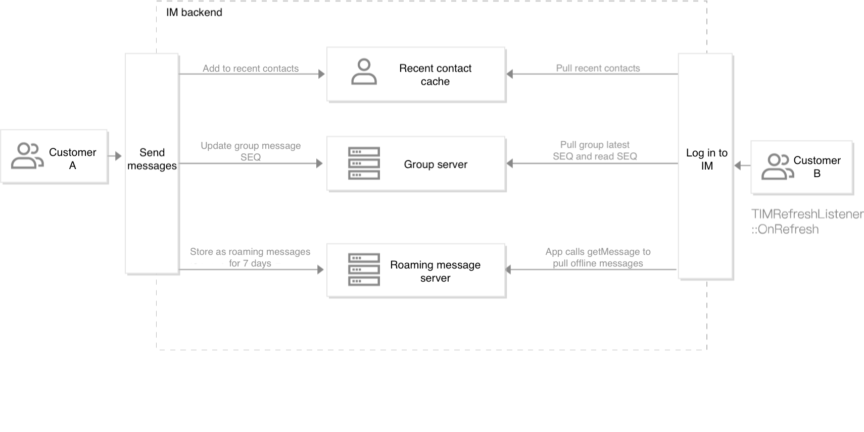 1.3 メッセージをローミングサーバーに保存します(期限は7日間)。loginインターフェースを呼び出して、IMにログインします。OnNewMessageインターフェースを介してスローします。OnRefreshインターフェースを介してグループメッセージ同期が完了したことをユーザーに通知します。getMessageを呼び出して、SDKはローミングサーバーを自動的にプルします。フィードバック
