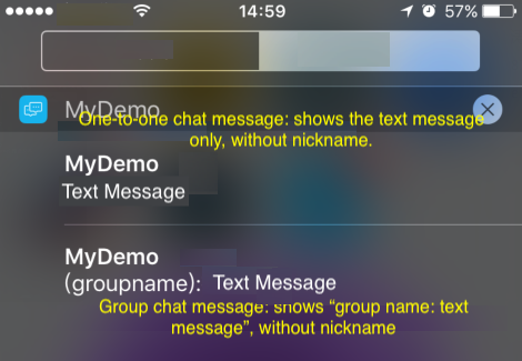 Desc | String | カスタムメッセージの説明情報。受信者がiOSまたはAndroidのバックグラウンドでオンラインの場合、オフラインプッシュテキストを表示します。 カスタムメッセージの送信中にOfflinePushInfo.Descフィールドが同時に設定されている場合、このフィールドは上書きされますので、OfflinePushInfo.Descフィールドを優先的に入力してください。 说明: メッセージにTIMCustomElemカスタムメッセージ要素が1つしかない場合、DescフィールドとOfflinePushInfo.Descフィールドが入力されていないと、メッセージのオフラインプッシュを受信できません。このメッセージのオフラインプッシュを受信するには、OfflinePushInfo.Descフィールドに入力する必要があります。 |