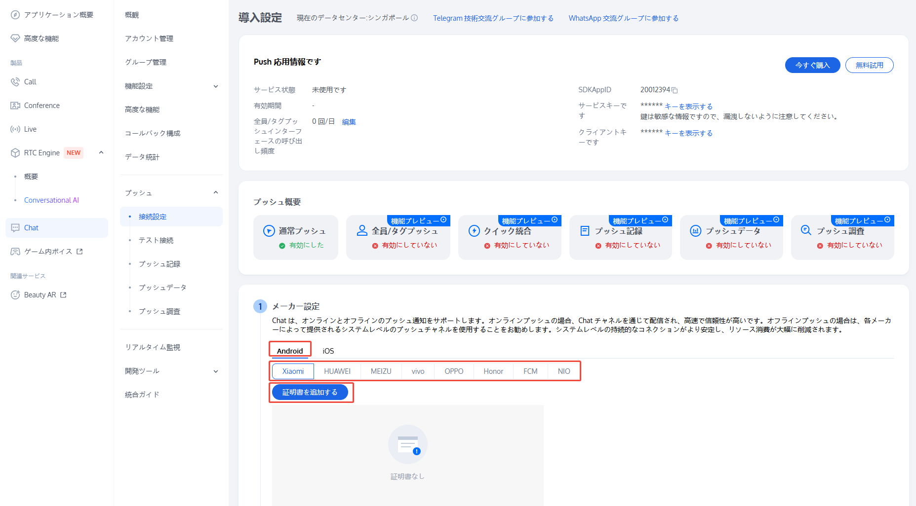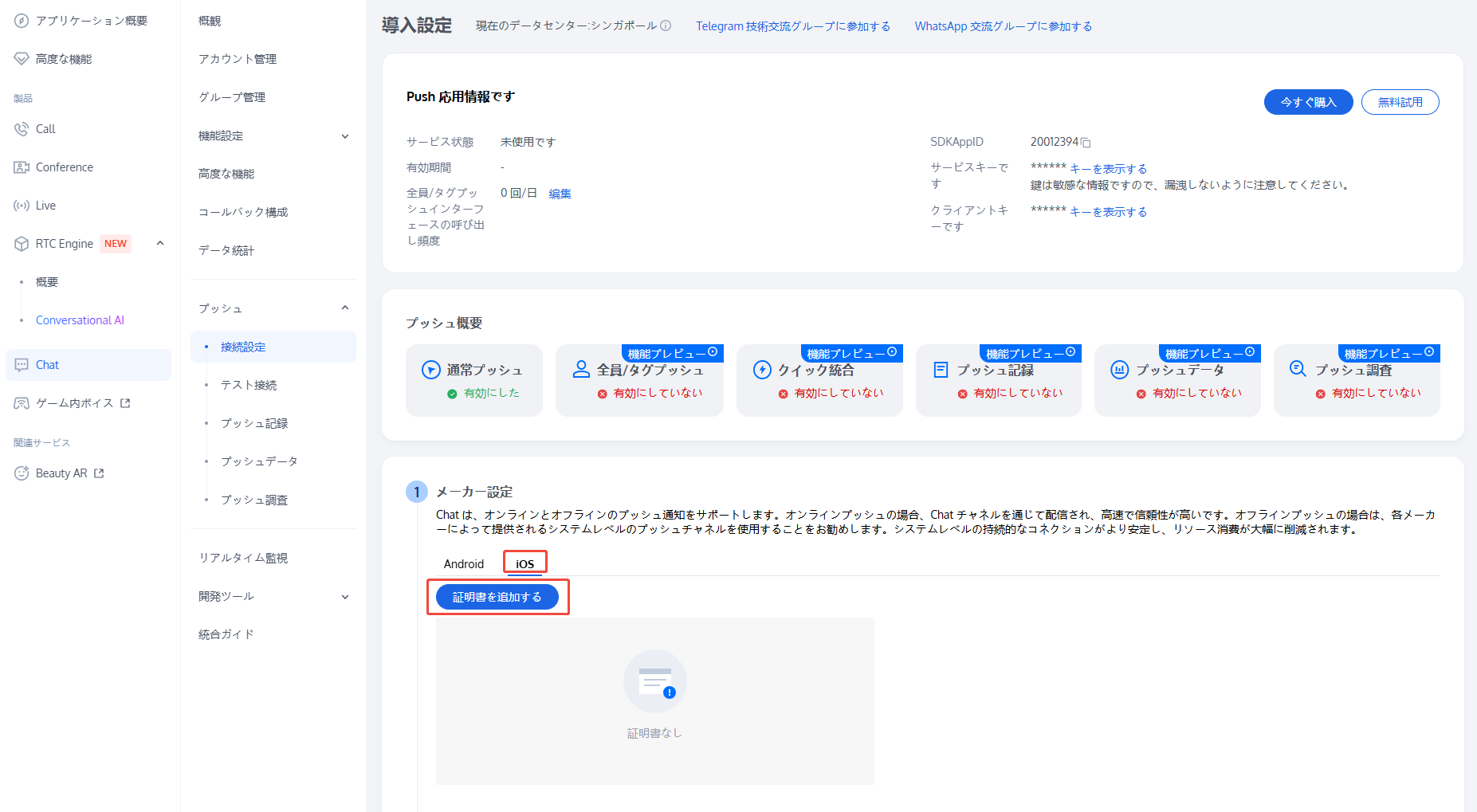キーはUserSigの生成に使用することができます。詳細な操作については、UserSigの生成をご参照ください。 オフラインプッシュ証明書の管理