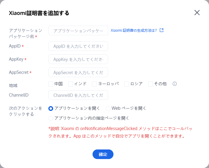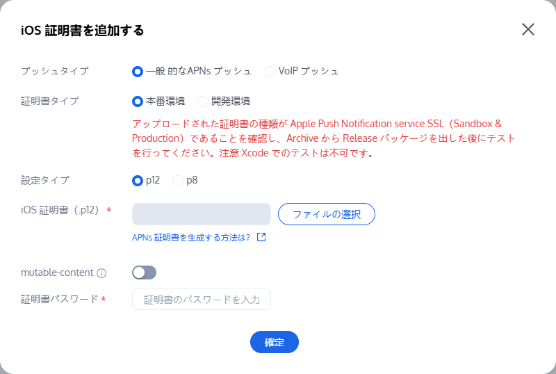 1. 対応するプラットフォームのプッシュ設定エリアで証明書の追加をクリックします。