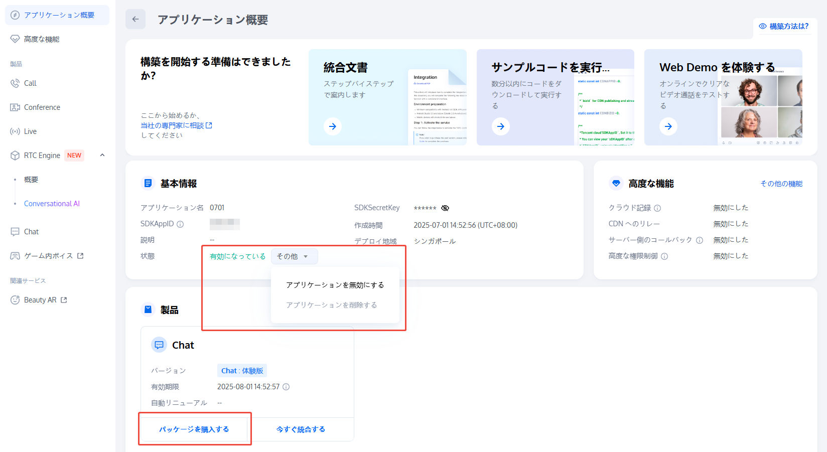 Chatコンソールにログインし、対象のアプリケーションカードをクリックして、アプリケーションの基本設定ページに進みます。実際の業務ニーズに応じて、アプリケーションの基本設定を管理することができます。 アプリケーションパッケージ情報