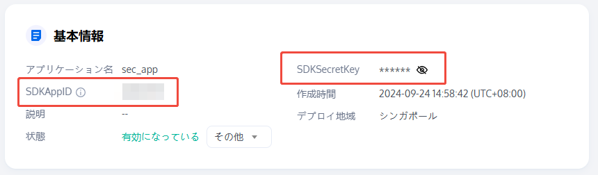 キー情報はセンシティブな情報ですので、適切に機密を保持し、漏えいしないようご注意ください。2019年8月15日より前に作成されたアプリケーション(SDKAppID)は、デフォルトで公開鍵と秘密鍵を区別するECDSA-SHA256署名アルゴリズムを使用しますので、HMAC-SHA256署名アルゴリズムへのアップグレードを選択することができます。アップグレードプロセスは、既存のネットワークサービスには影響を与えません。 1. キーの右側にあるキーの表示をクリックします。