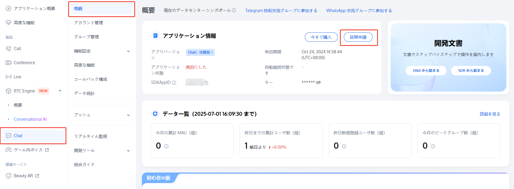 1. Chatコンソールにログインし、対象のアプリカードをクリックして、そのアプリの基本設定ページに進みます。 2. アプリプランエリアの延長申請をクリックします。