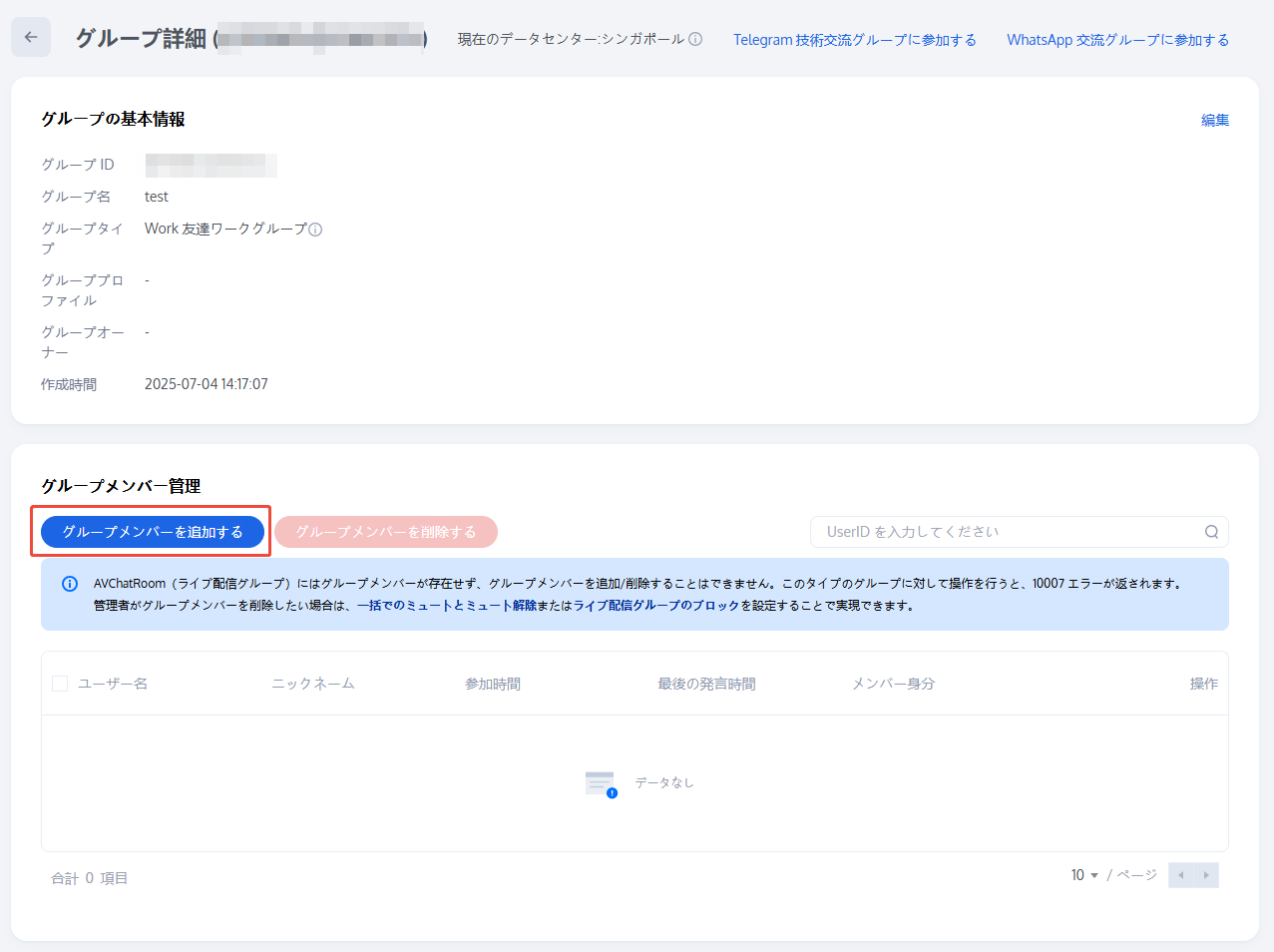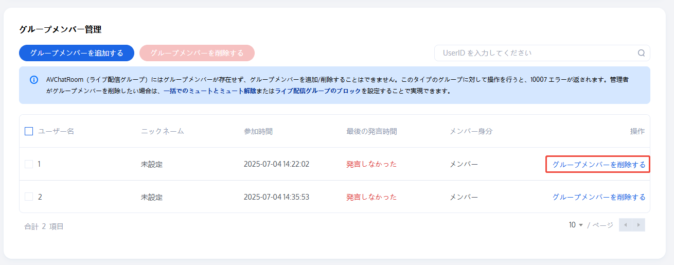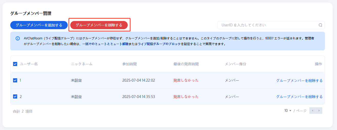 グループメンバーの追加が成功すると、グループメンバーリストで、ユーザー名、ニックネーム、参加時間、最終発言時間、メンバーのロールを表示することができます。